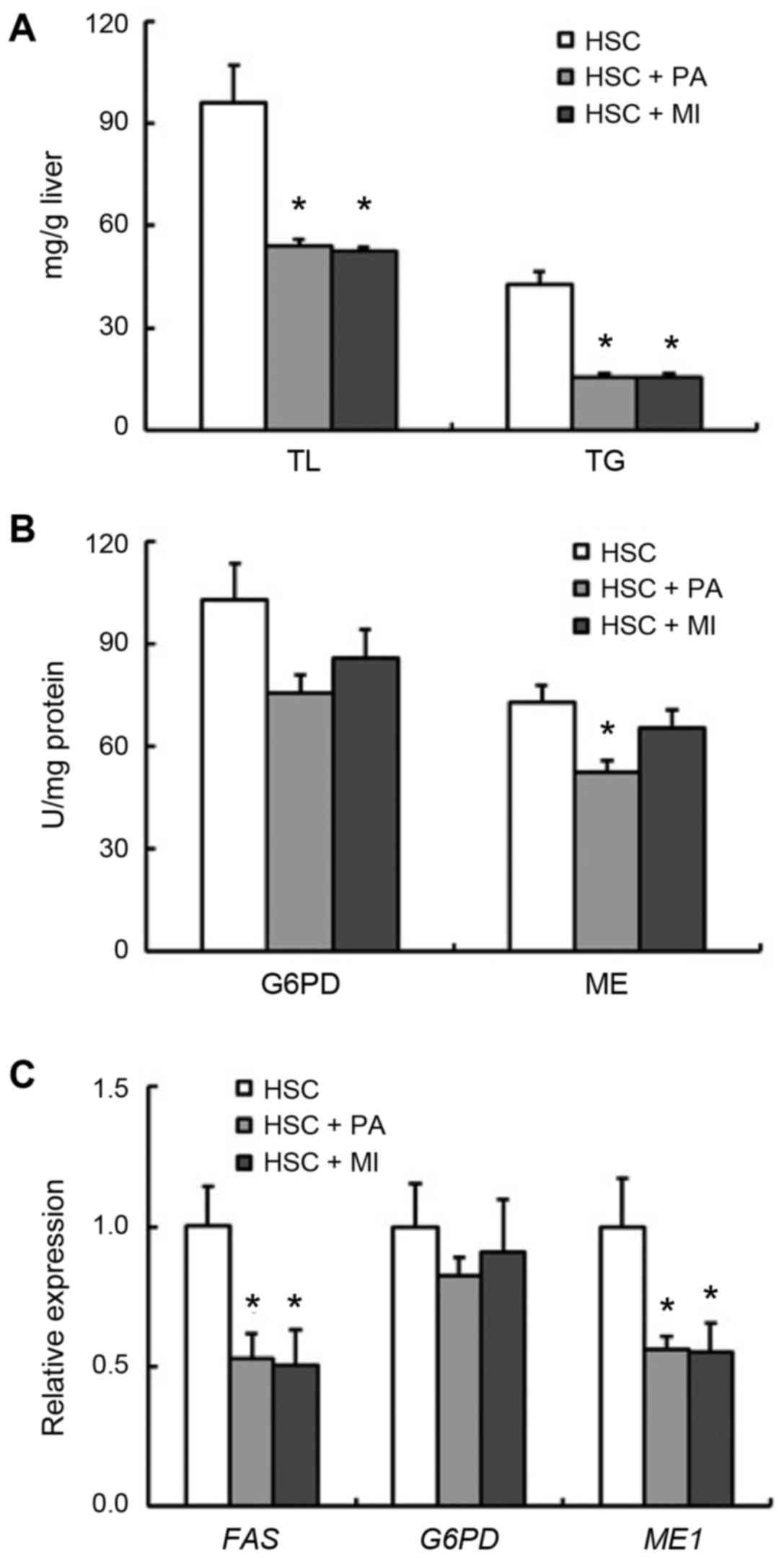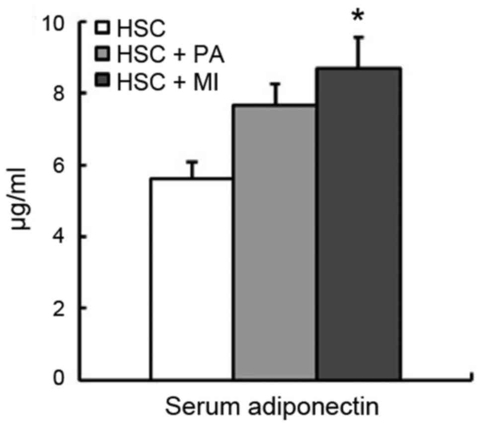It is well known that the plasma level of adiponectin is decreased in patients with nonalcoholic fatty liver disease (27,28). The delivery of recombinant adiponectin has been reported to alleviate alcoholic and nonalcoholic fatty liver diseases in mice (29). The present study observed that dietary MI increased the serum level of adiponectin. The same trend was observed in rats fed the HSC diet with PA. The serum adiponectin level was also negatively correlated with the liver TG concentration. Croze et al (18) recently demonstrated that dietary MI increased the plasma level of adiponectin in C57BL/6 mice fed a high-fat diet. The effect of dietary MI and PA on the serum level of adiponectin may be associated with their anti-fatty liver effect in rats fed an HSC diet. At present, a cDNA microarray analysis is in progress by our group to determine the gene expression profile in the liver of rats fed an HSC diet in response to dietary PA and MI. Liver transcriptome analysis has already revealed that PA or MI intake suppressed the expression of genes associated with lipid, fatty acid and long-chain fatty-acyl-CoA biosynthesis processes and the NADP-binding domain, which were upregulated by the HSC diet (unpublished data).