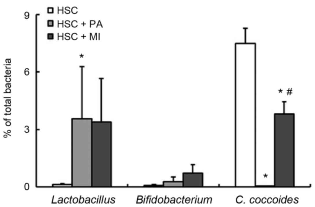 In experiment 2, the fecal and cecal weights were not significantly affected by dietary PA or MI (Table IV). In accordance with experiment 1, PA intake significantly increased the weight and lowered the pH of the cecal digesta (P<0.05). Similarly, MI intake moderately increased the digesta weight and significantly decreased the digesta pH (Table IV). The supplementation of PA in the HSC diet significantly increased the fecal ratio of Lactobacillus spp. and decreased the fecal ratio of C. coccoides compared with the HSC diet alone (P<0.05; Fig. 3). Similar to PA intake, MI intake decreased the ratio of C. coccoides (P<0.05) and moderately increased the ratio of Lactobacillus spp. (Fig. 3). No significant differences were detected in the fecal ratio of Bifidobacterium spp. among the three groups (Fig. 3). As presented in Table IV, dietary PA or MI significantly increased the cecal ratio of Lactobacillus spp. The cecal ratio of C. coccoides was decreased by dietary PA (P<0.05), but was not affected by dietary MI (Table IV). Dietary PA significantly increased the cecal ratio of Bifidobacterium spp. (P<0.05; Table IV); dietary MI also increased the ratio, but its effect was not significant (Table IV). Dietary PA or MI did not affect the cecal ratio of Bacteroides (Table IV). The cecal succinate level was increased by the supplementation of PA in the HSC diet, as in experiment 1; whereas it was unaffected by MI intake. MI intake also marginally increased the cecal butyrate level (P<0.05). The levels of all other cecal OAs were unaffected by PA or MI intake.