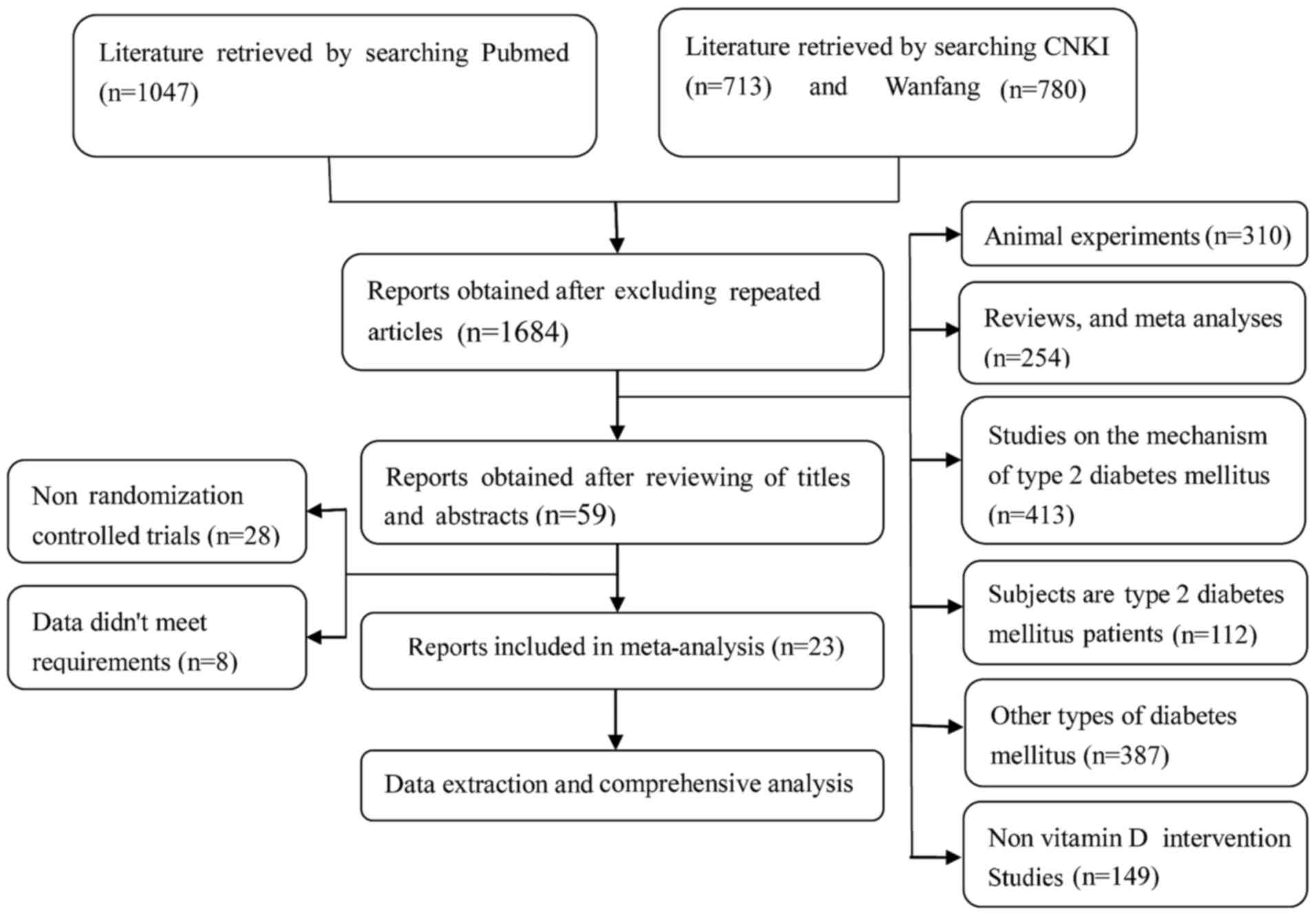 The inclusion criteria were as follows: i) Study subjects were non-diabetic individuals, including those with normal blood glucose (<6.1 mmol/l) and prediabetes (6.1–7.0 mmol/l) (26); ii) RCTs that focused on the influence of vitamin D deficiency on the indices related to blood glucose through vitamin D supplementation; iii) the intervention group vs. control group should be vitamin D vs. placebo, vitamin D + calcium vs. placebo + calcium or vitamin D + calcium vs. placebo; and iv) study outcome indicators included at least one of the following: Incidence rate or the number of participants who developed T2D, FPG measurements and/or homeostasis model insulin resistance index (HOMA-IR) data, with the value for FPG and HOMA-IR prior to and following supplementation expressed as the mean ± standard deviation (SD).