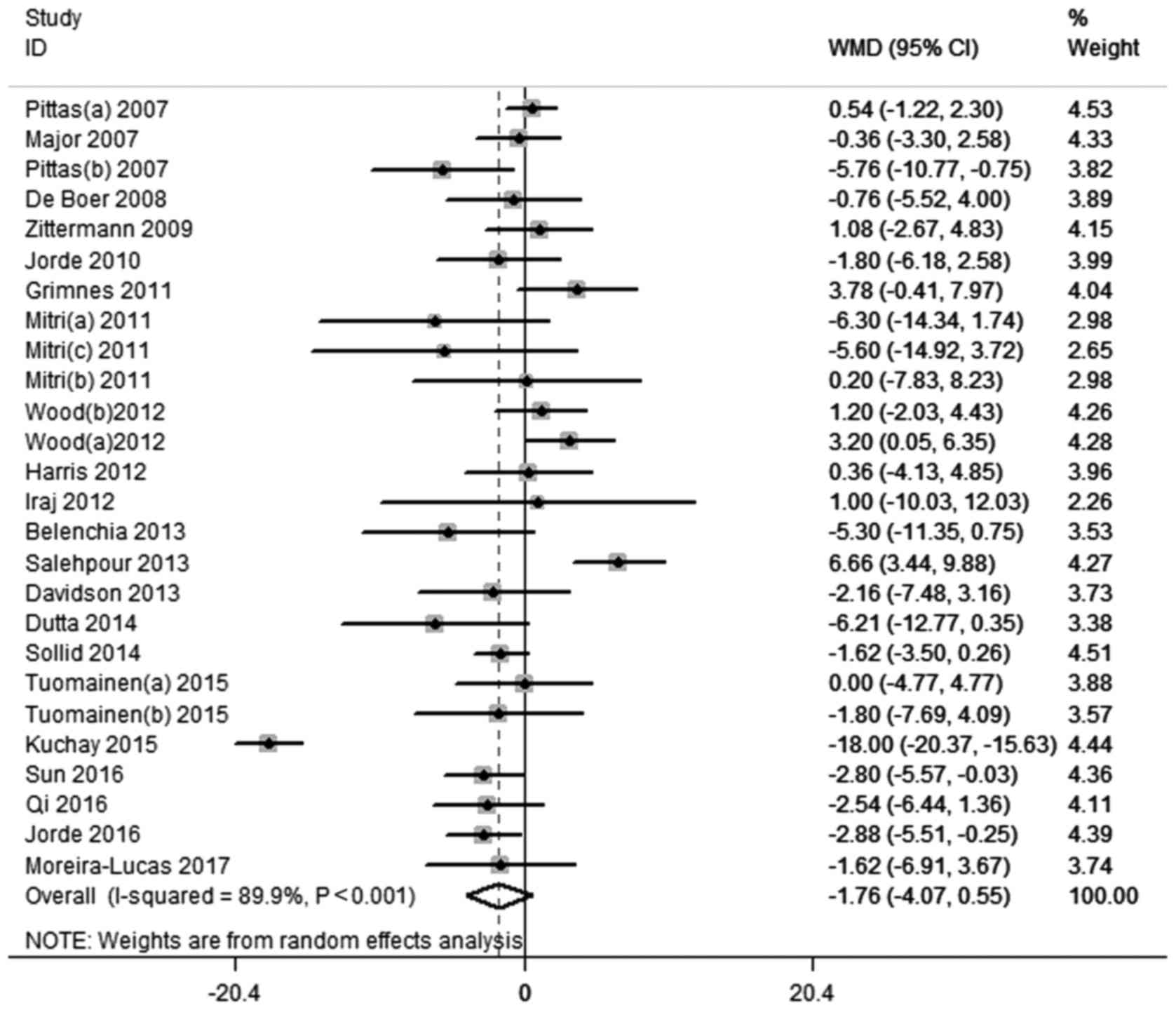A total of 21 studies (8,10–19,33,35–43) containing 26 RCTs reported FPG results. There was statistical heterogeneity between the studies (I2=89.9%, P<0.001). Subsequently, the random effect model was used for analysis. The results indicated that FPG following vitamin D intervention did not significantly decrease compared with control (MD=−1.76; 95% CI=−4.07, 0.55, P=0.135; Fig. 2). Subgroup analysis revealed that FPG levels in pre-diabetic individuals and in those whose BMI <25 with vitamin D supplementation were significantly lower than those of controls (MD=−3.40; 95% CI=−6.64, −0.15, P=0.041 and MD=−2.80, 95% CI=−5.57, −0.03, P=0.048, respectively; Table II). In the subgroup of baseline 25(OH)D3 insufficiency [20≤ 25(OH)D <30 ng/ml)], the level of FPG following vitamin D supplementation compared with control was significantly decreased (MD=−1.99, 95% CI=−3.25, −0.73, P=0.002; Table II).