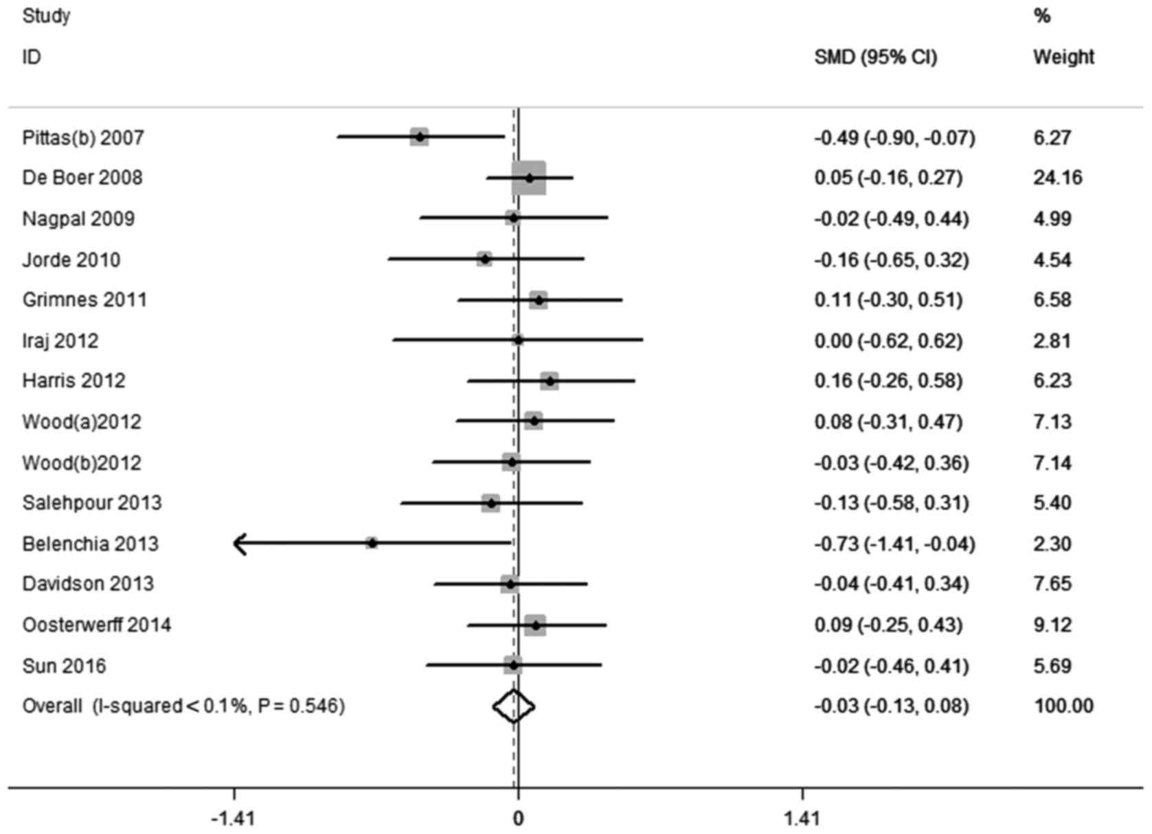 A total of 13 studies (8–10,12–15,18,33,34,39,41,43) containing 14 RCTs reported HOMA-IR results. There was no statistical heterogeneity between the studies (I2<0.01%, P=0.546). Therefore, the fixed effect model was applied for analysis of the results. The meta-analysis indicated that there were no statistically significant changes in HOMA-IR following vitamin D intervention compared with control (SMD=−0.03, 95% CI=−0.13, 0.08, P=0.635; Fig. 3). In the subgroup of baseline 25(OH)D3 sufficiency [25(OH)D ≥30 ng/ml)], HOMA-IR following vitamin D supplementation was significantly lower than that of controls (SMD=−0.49, 95% CI=−0.90, −0.07, P=0.021; Table II).