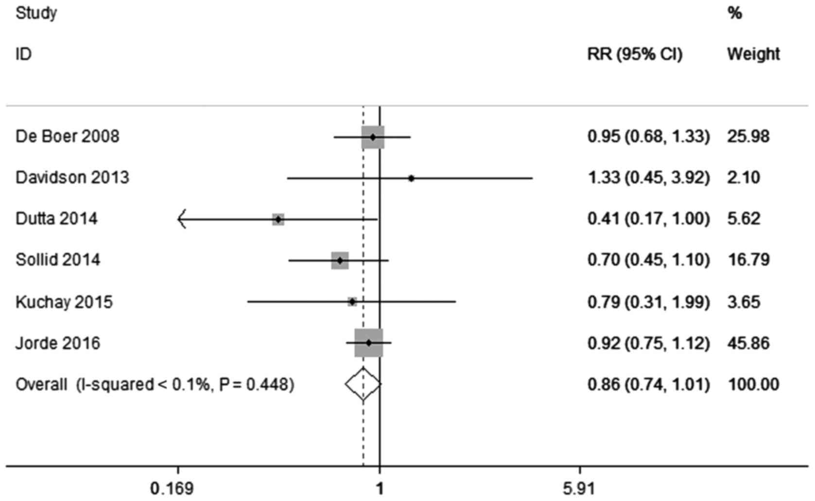 A total of 6 studies (11,13,17–19,38) containing 6 RCTs reported RR results. There was no statistical heterogeneity between the studies (I2<0.01%, P=0.448). Subsequently, the fixed effect model was used for analysis. The results suggested that there was no statistically significant difference in the incidence of T2DM following vitamin D intervention or control in the non-diabetic population (RR=0.86, 95% CI=0.74, 1.01, P=0.072; Fig. 4). Subgroup results indicated that the incidence of T2DM decreased following intervention with vitamin D supplement dose >2,000 IU/day and in those with intervention without calcium (RR=0.84, 95% CI=0.70, 1.00, P=0.047 and RR=0.84, 95% CI=0.70, 1.00, P=0.047, respectively; Table II). In addition, the incidence rates of T2DM in pre-diabetic individuals and in overweight (25≤ BMI <30) individuals were lower than that in controls (RR=0.84, 95% CI=0.70, 1.00, P=0.047 and RR=0.82, 95% CI=0.69, 0.98, P=0.032, respectively; Table II).
