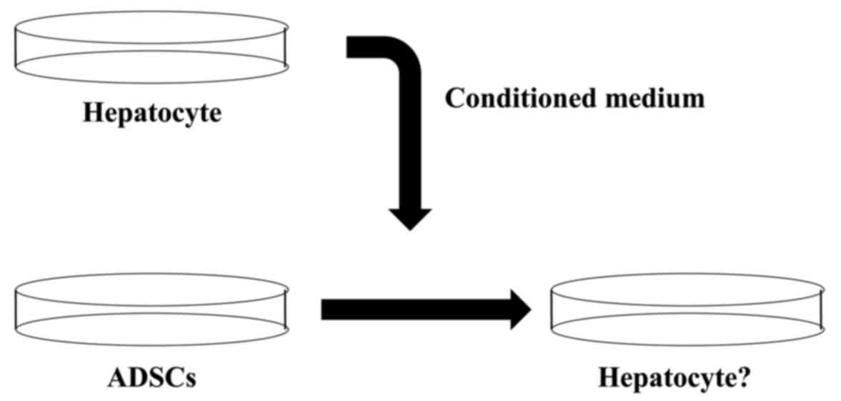 Adipose-derived mesenchymal stem cells (ADSCs) have the potential to differentiate into numerous types of cells including adipocyte, chondrocytes, osteocytes, cardiomyocytes, vascular endotherial cells, pancreatic β cells and hepatocyte cells (1–9). ADSCs can be obtained in high yield with minimal discomfort under local anesthesia (10,11). Therefore, ADSCs are considered a useful source for regenerative therapy (12). However, in particular endodermal types of cells, the differentiation method has not been well established and differentiation efficiency is extremely low. Thus, the development of an efficient differentiation method is extremely important. Several studies suggested that conditioned medium contains several undefined factors (8,12). These undefined factors induce the stem cells to certain specific types of cells (1).