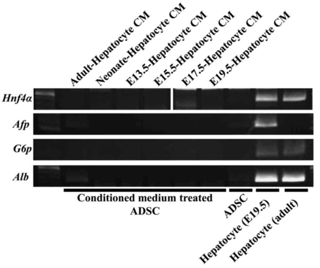 Mouse hepatocytes were isolated from E13.5, E15.5, E17.5 and E19.5 C57BL/6JJcI mice (Charles River Laboratories, Willmington, MA, USA), either newborn (within 2 weeks) or adult (12 weeks) C57BL/6JJcI mouse (Nihon Clea). Briefly, when the mice were sacrificed, the liver was removed, minced into small sections, collected with hepatocyte-culture medium, centrifuged at 85 × g for 3 min to remove cell debris, incubated with 0.1% collagenase type IV (Worthington Biochemical Corp.,) and agitated in a water bath at 37°C for 30 min. Subsequently, the mixtures were added to hepatocyte culture medium followed by centrifugation at 800 rpm for 3 min to remove cell debris, damaged cells and non-parenchymal cells. The remaining liver parenchyma was collected in hepatocyte culture medium, passed through a 70-µm sterile filter (Corning Inc.) and cultured at 500,000/ml at 37°C and 5% CO2. The hepatocyte culture medium consisted of DMEM-high glucose with 10% FBS, 500 µg/ml of penicillin-streptomycin, 0.5 µg/ml insulin (Sigma-Aldrich, St. Louis, MO, USA), 1 µM dexamethasone (Sigma-Aldrich), 10 ng/ml epidermal growth factor (Peprotech, Inc., Rocky Hill, NJ, USA) and 200 µM ascorbic acid (Sigma-Aldrich). Culture media were replaced every 2 days. The conditioned medium was generated according to the previous study by Kawamoto et al (12). In detail, these hepatocytes grew to ≤50% confluence with hepatocyte culture medium. Subsequently, the hepatocyte culture medium was replaced with fresh medium on day 2. After a 48-h culture period, the medium was collected (#1) and replaced with fresh medium. Subsequently, CMs were collected every 48 h incubation (#2). These conditioned media (#1 and #2) were pooled and filtered using a bottle-top filter (Corning, Inc.) to remove cells and debris. Conditioned medium samples were frozen at −20°C for later use. Induction of hepatogenic differentiation of mouse ADSCs was by hepatocyte-conditioned medium. For evaluation of the hepatogenic differentiation ability, mouse ADSCs were cultured with these types of hepatocyte-conditioned medium at 37°C and 5% CO2. These cells were maintained by media exchange every 2–3 days for 2 and 4 weeks, and subsequently they were collected for RNA isolation.