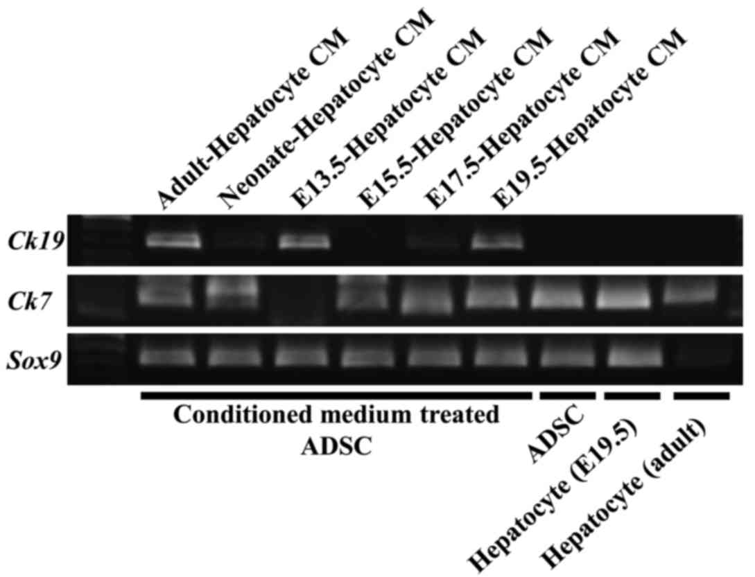 In the present study, ADSCs were cultured in hepatocyte-derived conditioned medium from mice of various ages and conditioned medium from hepatocyte cells. To the best of our knowledge, this is the first study to assess the differentiation of ADSCs into bile cell lineages using murine fetal hepatocyte-derived culture medium.