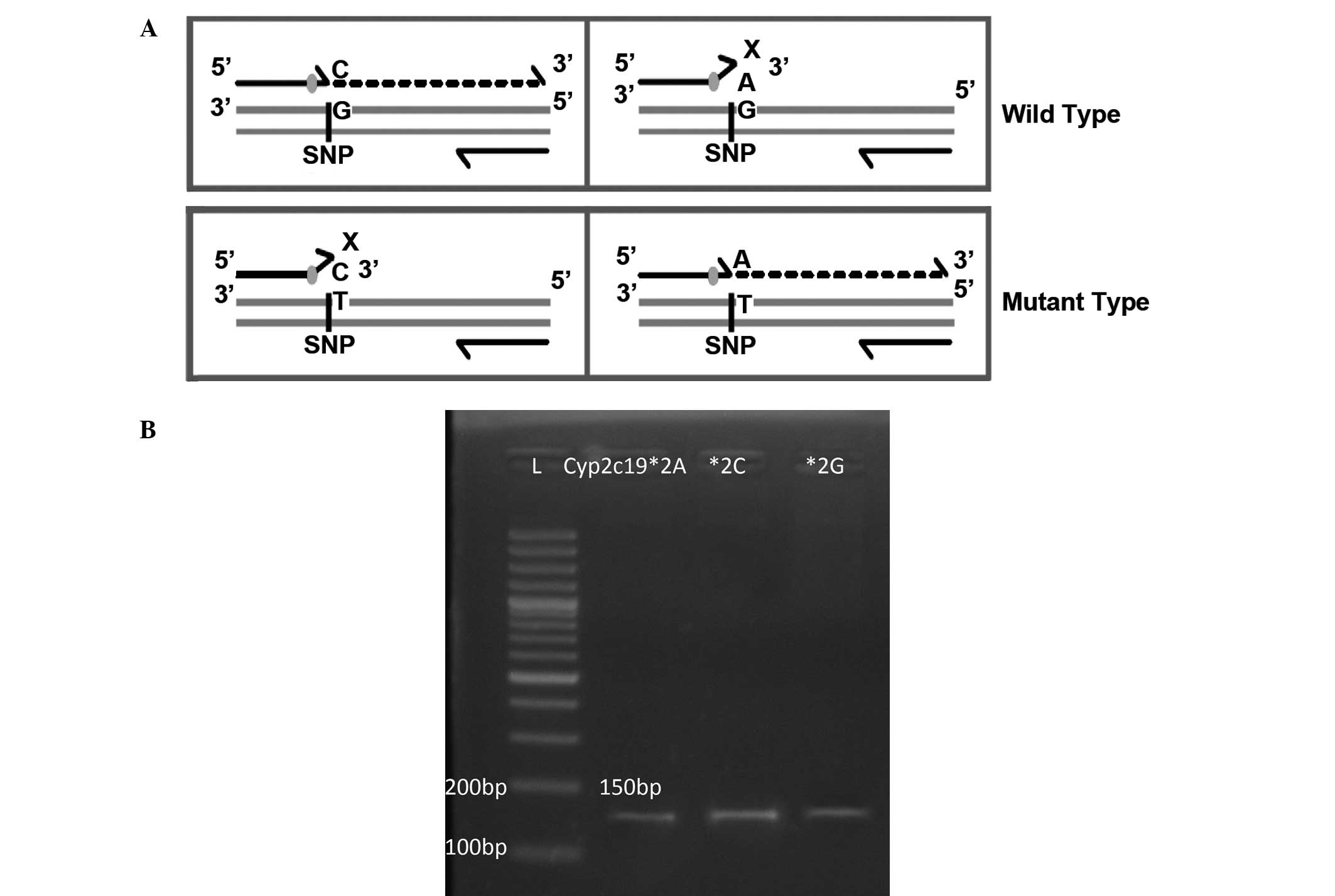 Design of primersThe allele-specific and amplification primers for allelic variants of CYP2C19*2 were designed using Primer 3 (http://frodo.wi.mit.edu) and their sequences are shown in Table I. Genomic DNA flanking the SNP was amplified with allele-specific primers. Three different pairs of primers were used for SNP amplification, one with wild-type allele-specific primer and the other two with mutant allele-specific primer; the reverse primer was non-allele-specific and identical in wild and mutant genotypes (Fig. 1A). The strategy for the design of allele-specific primers followed that of Hirotsu et al (16).
