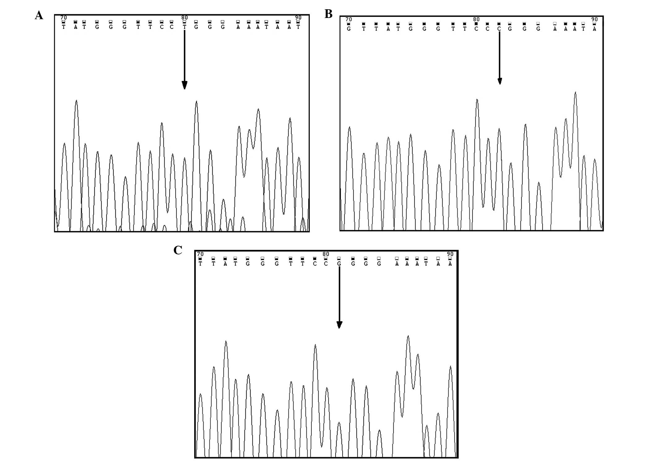 Sanger sequencingIn order to validate the gel-based method of SNP identification, Sanger sequencing of the purified PCR products of selected samples was performed to confirm the different allelic variants of CYP2C19*2. Sequencing of the purified products using reverse primers was conducted with the BigDye® Terminator v3.1 Cycle Sequencing kit according to the instructions of the manufacturer (Applied Biosystems, Foster City, CA, USA). The amplification consisted of pre-denaturation at 96°C for 1 min, followed by 35 cycles of denaturing at 96°C for 15 sec, annealing at 55°C for 15 sec, and extension at 72°C for 1 min, and a final extension at 72°C for 5 min. Sequencing products were resuspended in 10 µl formamide and denatured at 95°C for 5 min. The DNA sequencing was performed on an ABI PRISM 3100 Genetic Analyzer (Applied Biosystems). The sequencing results were assembled using ABI PRISM sequencing analysis software version 3.7 (Applied Biosystems) and analyzed with Chromas software (http://www.technelysium.com.au/chromas.html). The chromatograms of different SNP variants using reverse primers for sequencing are presented in Fig. 2A (CYP2C19*2A), Fig. 2B (CYP2C19*2G) and Fig. 2C (CYP2C19*2C).