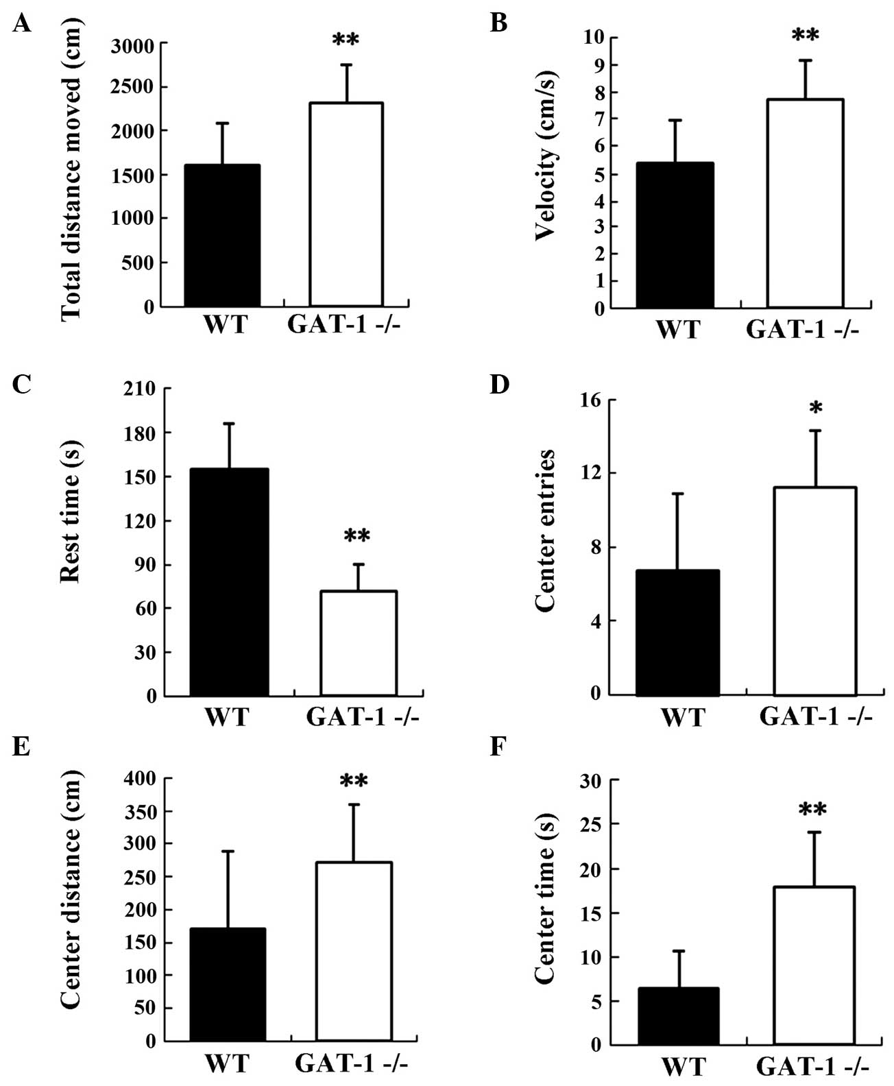 In the open-field test, GAT-1−/− mice traveled greater distances compared with the WT mice (GAT-1−/−, 2,312.98±439.58 cm; WT, 1,607.78±476.26 cm; P<0.01), and exhibited enhanced kinematic velocity (GAT-1−/−, 7.70±1.46 cm/sec; WT, 5.36±1.59 cm/sec; P<0.01), with a significant reduction in rest time (GAT-1−/−, 71.97±18.42 sec; WT, 155.30±30.32 sec; P<0.01). The GAT-1−/− mice manifested hyperactivity and enhanced motility compared with the WT mice. In addition, the GAT-1−/− mice spent more time in the central area (GAT-1−/−, 17.87±6.16 sec; WT, 6.43±4.20 sec; P<0.01) and made more entries into the central area when compared with the WT mice (GAT-1−/−, 11.22±3.0; WT, 6.70±4.22; P<0.05). GAT-1−/− mice also showed a significant increase in the distance traveled in the central area (GAT-1−/−, 272.36±87.09 cm; WT, 170.39±117.68 cm; P﹤0.01). These parameters are inversely correlated with the level of anxiety-related proneness, indicating that GAT-1−/− mice showed decreased anxiety-like behaviors in comparison with the WT mice (Fig. 1).