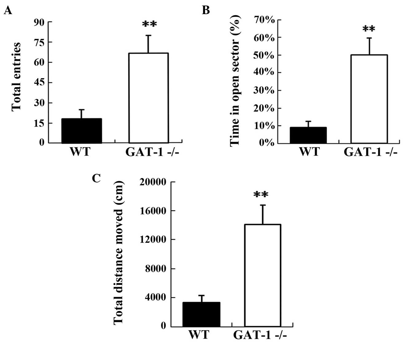 GAT-1−/− mice manifested hyperactivity and enhanced motility in the EZM test, as compared with the WT mice, and traveled greater distances (GAT-1−/−, 14,097.96±2,775.40 cm; WT, 3,356.12±968.37 cm; P<0.05). The results revealed that GAT-1−/− mice had a significantly higher total number of entries into the open and closed sectors compared with the WT mice (GAT-1−/−, 66.78±13.07; WT, 18.00±6.83; P<0.01). In addition, the GAT-1−/− mice exhibited an increased percentage of time spent in the open sectors when compared with the WT mice (GAT-1−/−, 50.00±0.097%; WT, 9.00±0.036%, P﹤0.01). Therefore, the results confirmed that GAT-1−/− mice demonstrated reduced anxiety-like behaviors (Fig. 2).