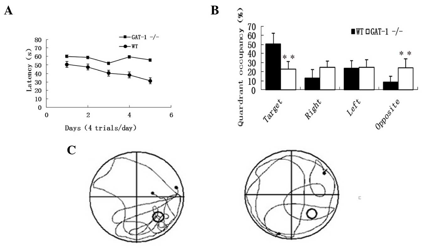 Experimental protocols and the use of animals were performed in compliance with the Guidelines for Animal Experiments of the Chinese Academy of Medical Sciences (Beijing, China) and with approval from the Ethics Committee for Animal Care at Jinshan Hospital (Shanghai, China). In total, 20 adult male GAT-1−/− and WT mice were obtained from Shanghai South Biomodel Organism Co., Ltd. (Shanghai, China) and housed in the animal center of Jinshan Hospital. The animals were maintained under a 12-h light/dark cycle at 22°C and 50% humidity. The animal rooms were kept neat and uncluttered. The drinking water was autoclaved and changed everyday, and the animal cages were disinfected by ultraviolet light. The padding used in the cages was also changed everyday. Food and water were available ad libitum, with the exception of during the tests. The mice (age, 6–8 weeks) were divided into two groups (n=10): GAT-1−/− and WT.