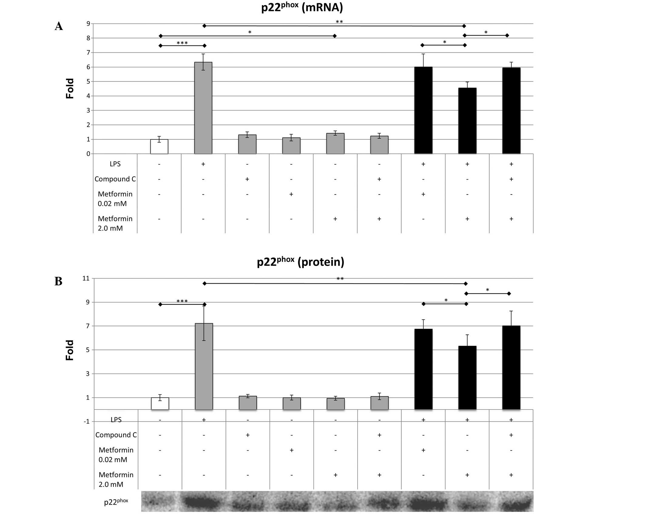 Oxidative stress is necessary for the control of exogenous potentially harmful stimuli, such as bacterial infection. p22phox is the primary source of ROS, and this enzyme is predominantly located in the mitochondria. Metformin is a key factor in the homeostasis of energy expenditure, and is also predominantly located in the mitochondria. The generation of ROS requires high amounts of energy. The results of the present study suggest that metformin reduced the expression of p22phox in LPS-treated macrophages. It was hypothesized that this effect was mediated by AMPK activation, which was confirmed by experiments employing compound C, a pharmacological inhibitor of AMPK. These results are consistent with the results of previous studies on murine podocytes and human endothelial cells (22,23). Furthermore, a previous study reported that metformin reduced ROS generation by inhibition of respiratory chain complex-1 (24). The results of our previous study indicate that metformin dose-dependently reduces ROS generation in macrophages treated with LPS (1), and the current findings suggest that using higher concentrations of metformin is markedly more effective for reducing p22phox expression. However, it is notable that the reduction of p22phox expression was not observed in unstimulated cells, which may be because AMPK activation is a crucial regulator of oxidative stress in cells subjected to inflammatory conditions, and it does not significantly affect redox status in cells that have not been subjected to LPS.