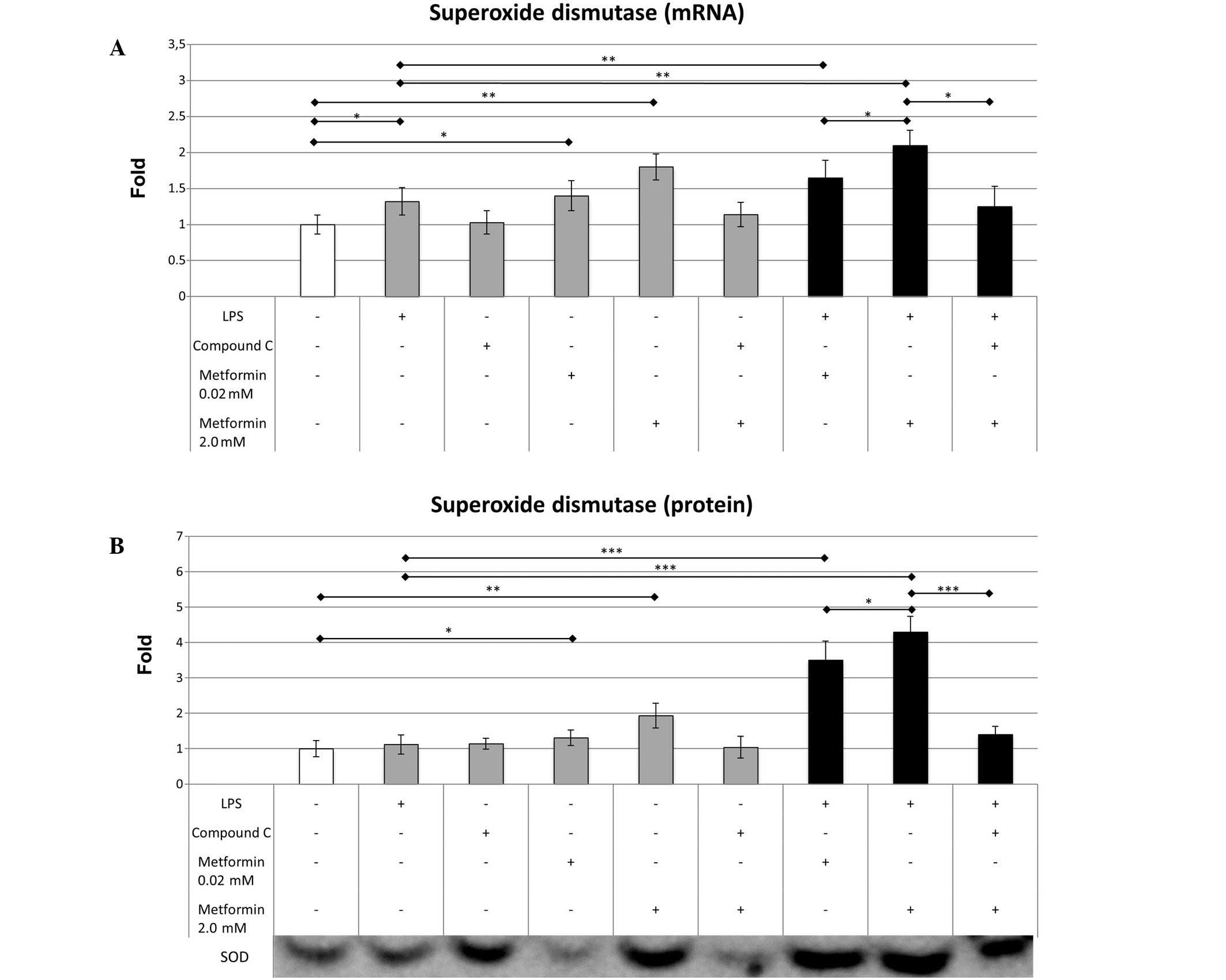 LPS caused a small increase in the mRNA expression level of SOD (1.32±0.19 vs. 1.0±0.13; P=0.038) compared with that in the control cells; however, it did not significantly change SOD protein expression (1.12±0.27 vs. 1.0±0.23) (Fig. 3). Metformin at 0.02 µM significantly increased the mRNA expression level of SOD (1.4±0.21 vs. 1.0±0.13; P=0.027), while 2.0 mM metformin significantly elevated the mRNA (1.8±0.18 vs. 1.0±0.13; P=0.006) and protein (1.95±0.35 vs. 1.0±0.23; P=0.007) expression levels of SOD compared with those in the control group. The addition of 0.02 mM metformin to LPS-treated cells resulted in a moderate increase in SOD mRNA expression (1.65±0.24 vs. 1.32±0.19; P=0.009) compared with that in the cells treated with LPS alone. Metformin at 2.0 µM produced a more marked difference in SOD mRNA expression (2.1±0.21 vs. 1.32±0.19; P=0.005) in the LPS-treated cells. The effect of metformin on SOD protein concentration was particularly marked in the cells treated with 0.02 µM (3.5±0.54 vs. 1.12±0.27; P<0.001) and 2.0 mM metformin (4.3±0.44 vs. 1.12±0.27; P<0.001), indicating that metformin increases the expression of SOD more effectively in an inflammatory environment. Compound C reduced the effect of 2.0 mM metformin on SOD mRNA (1.25±0.28 vs. 2.1±0.21; P=0.006) and protein (1.4±0.23 vs. 4.3±0.44; P<0.001) expression levels, which resulted in mRNA expression levels similar to those of the LPS-treated macrophages (1.25±0.28 vs. 1.32±0.19; P=0.425); however, the protein expression levels of SOD remained slightly elevated (1.4±0.23 vs. 1.12±0.27; P=0.048).