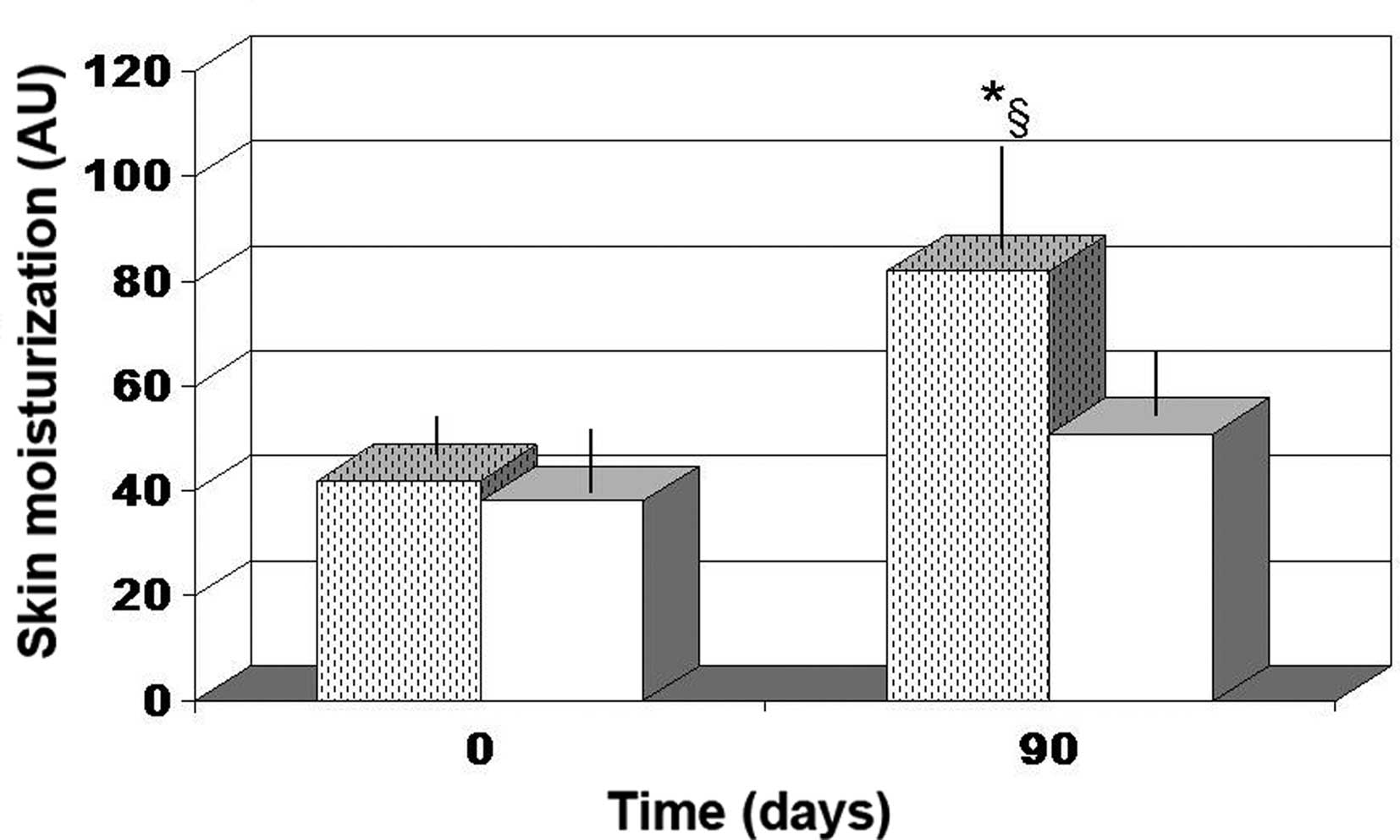 The study enrolled 60 healthy non-smoker males and females with an age of 40–65 years, all of whom showed clinical signs of skin aging (including wrinkles, dull complexion and brown spots). The inclusion criteria were as follows: Caucasian ethnicity; Fitzpatrick skin type I–III (25); dull complexion; normal body mass index; absence of current or prior skin diseases; compliance to abstain during study period from any topical application of compounds, with the exception of standard cleaning soap; and no know food intolerances.