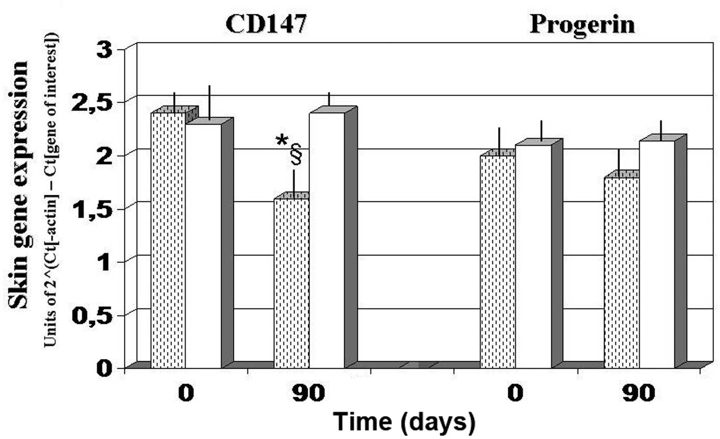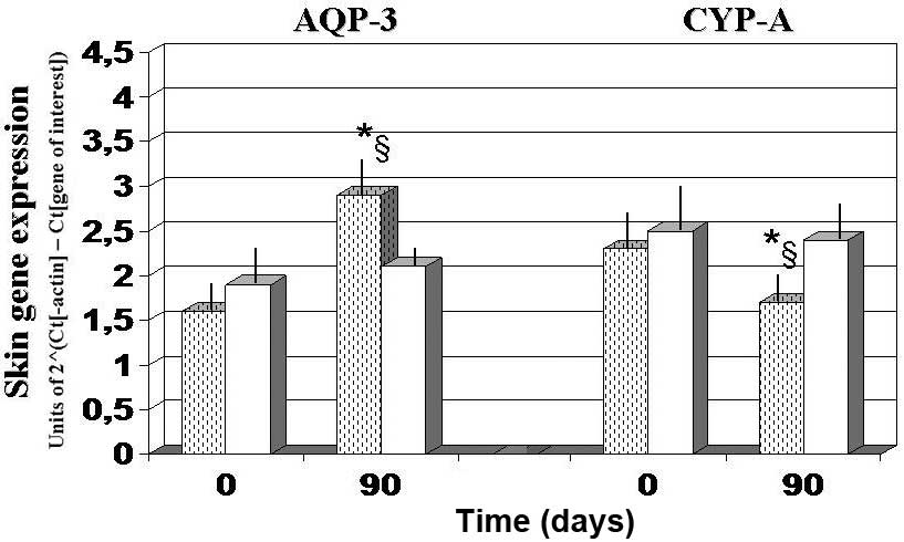Genes recently highlighted (18–20) as playing a relevant role in aging and oxidative protection (including AQP-3, CyPA and CD147) along with an intrinsic aging-associated gene (progerin) were investigated. Reverse transcription-polymerase chain reaction (RT-PCR) was used to determine their expression at 0 days and after 90 days.