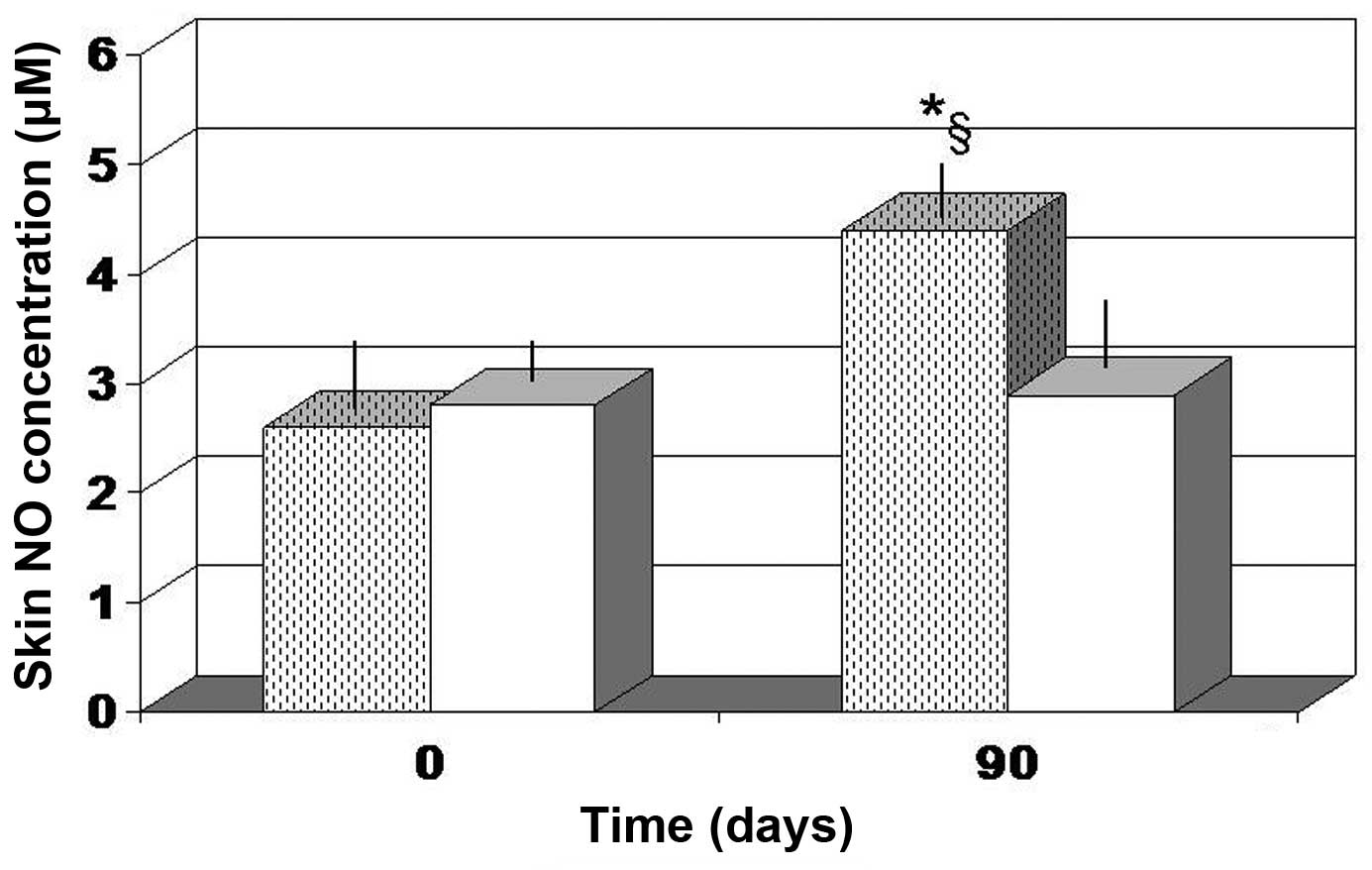 Following a thorough skin cleansing, a sterilized microdialysis probe was gently inserted into the forearm skin while carefully avoiding fluid exudation. Next, 0.3 ml of 100 µM 4,4′-sulfonyldianiline in sterile normal saline (pH 5.8–6.0) was fed to a microdialysis tube and maintained for 20 min to allow for local absorption of NO. The total NOx− concentration (NO2− and NO3−) was calculated in the dialysate using the ozone phase chemiluminescence method (NOA280i; GE Analytical Instruments, Boulder, CO, USA), with a lowest sensitivity of 1.0 pM. A 5 µl sample of fresh dialysate was then reduced by a vanadium(III)/HCl solution. The resulting NO gas was reacted with ozone to generate a chemiluminescent reaction, and the nitrate calibration curve was set using graded concentrations of NaNO3 diluted in sterile nitrogen-free water. The whole quantity of NO3 in each dialysate sample was measured by correlating the signal peaks through nitrate curve calibration. Triplicate measurements were performed. The presence of (NO2−) in the dialysate samples was equalled to the water basal level so that the final NOx concentration in the dialysate was expressed in µM units (32).