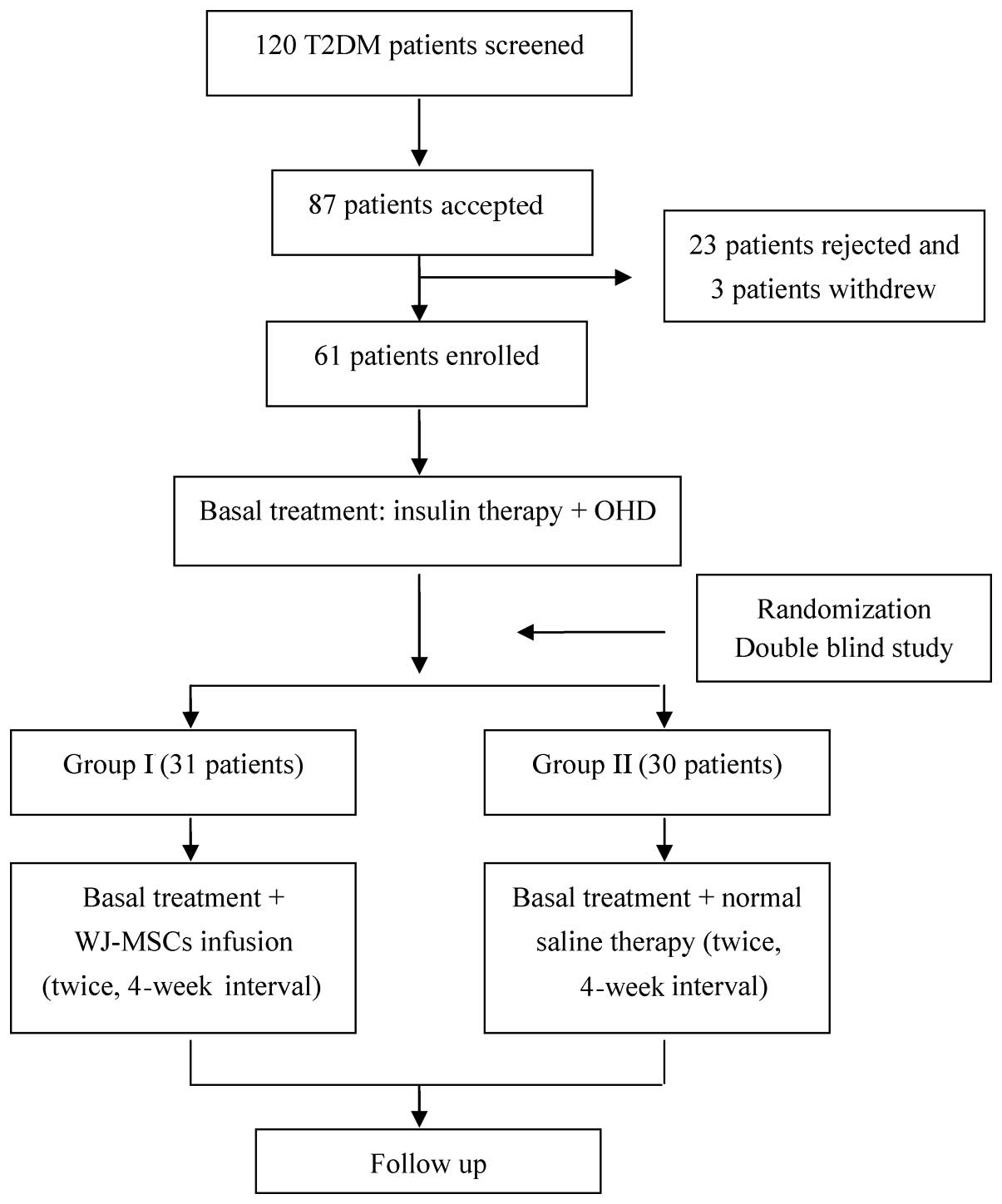 Study participants were selected from patients admitted to the Affiliated Hospital of Qingdao University for the treatment of diabetes mellitus between September 2010 and December 2011. A total of 87 patients met the inclusion criteria and, following an interview, 64 patients were enrolled. Although 64 patients with T2DM were initially enrolled (Fig. 1), 2 patients in group II and one patient in group I withdrew at the start of follow-up due to immigration to other distant city and a lack of availability. The remaining 61 patients completed the entire study and their data were analyzed. Using a balanced permuted-block randomization method, participants were divided into two groups: The WJ-MSC treatment group (group I; n=31) and the control group (group II; n=30). All patients were subsequently enrolled, treated and followed-up for 36 months until April 2014 at the Stem Cell Center of the Affiliated Hospital of Qingdao University.