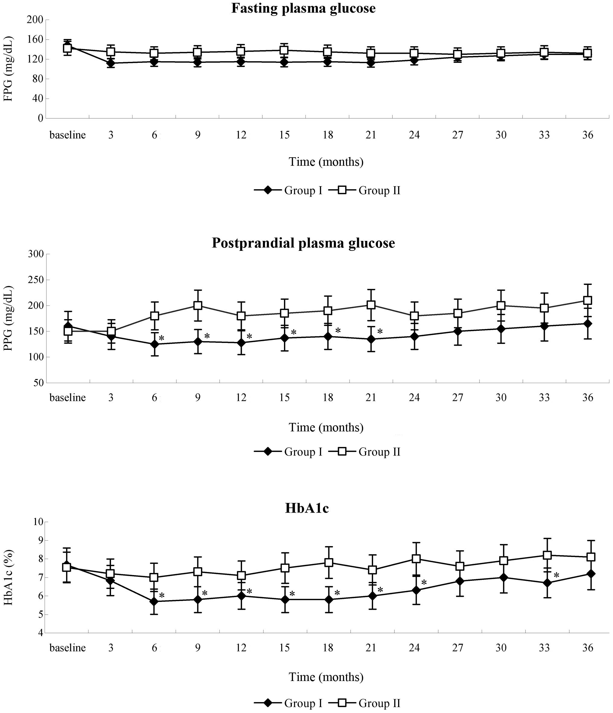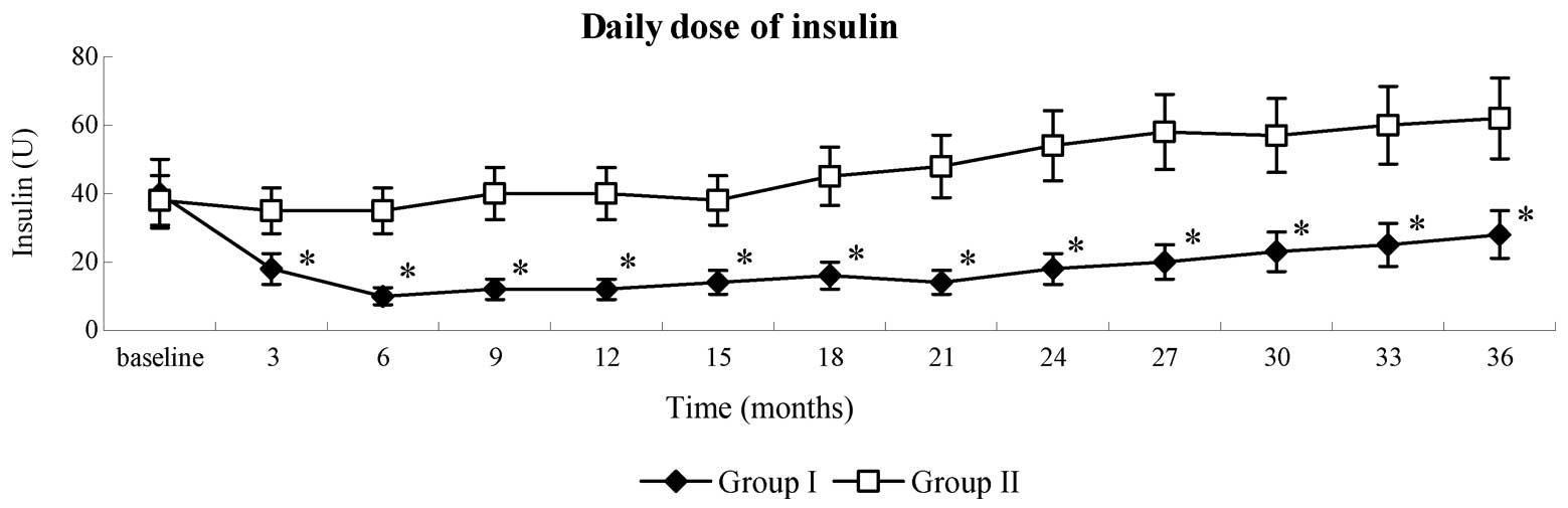 All patients enrolled into the present study were assessed in the diabetic out-patient clinic for a period of 3 months prior to the initiation of therapy, and were recommended a 1,500-calorie diet and exercise routine, which composed of walking or similar exercise for 1 h three times/week during the entire study and follow-up period. At the initiation of therapy, all patients had been treated with diet, exercise, oral hypoglycemic agents [1500 mg/d dimetyl biguanide (0.5 g t.i.d.) and 4 mg/d avandia] and insulin injections, which were considered baseline treatment, at stable doses for at least two months.
