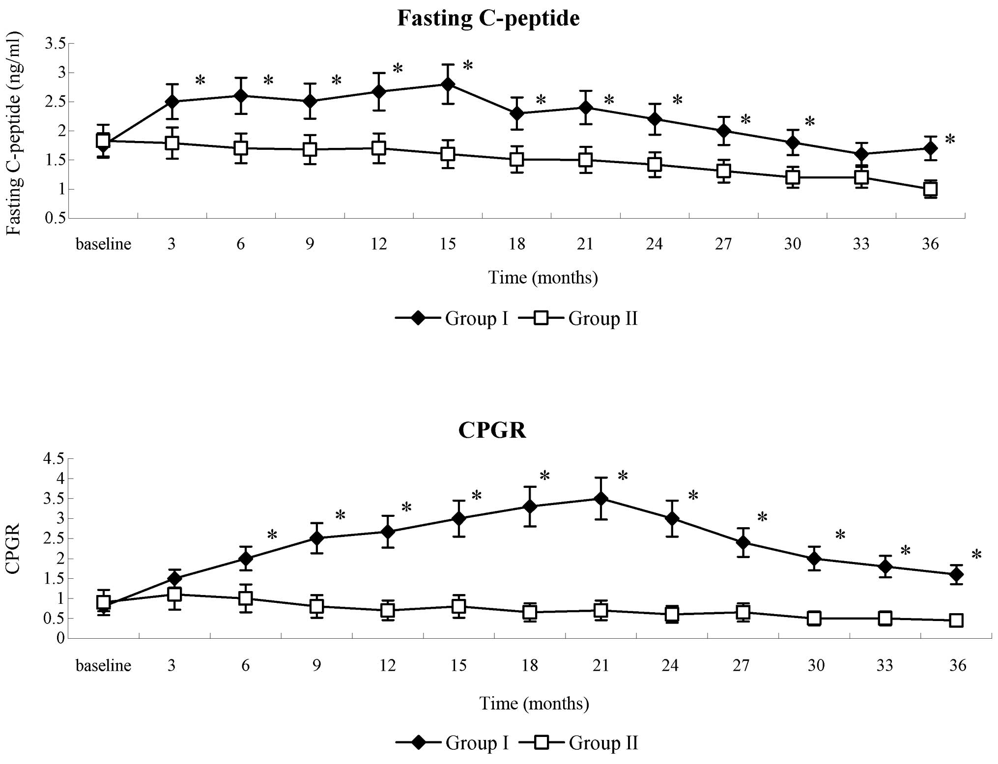 Following WJ-MSC infusion, the levels of fasting serum C-peptide in patients in group I decreased at month 1, then progressively increased at month 3 and remained constant for 15 months, with a slight decrease at month 18. At the end of follow-up, the mean levels of fasting C-peptide in group I remained higher than the baseline. In group II patients, fasting C-peptide levels gradually decreased. Fasting C-peptide levels were significantly increased in group I, as compared with group II, throughout the entire follow-up period (P<0.001), with the exception of month 33 post-therapy (Fig. 3). The CPGR gradually increased in group I during the initial 21 months of the follow-up period, followed by a gradual decline to the end of the follow-up. A gradual decrease in CPGR was detected in group II patients. CPGR values were significantly increased in group I, as compared with group II, throughout the entire follow-up period (P<0.001).