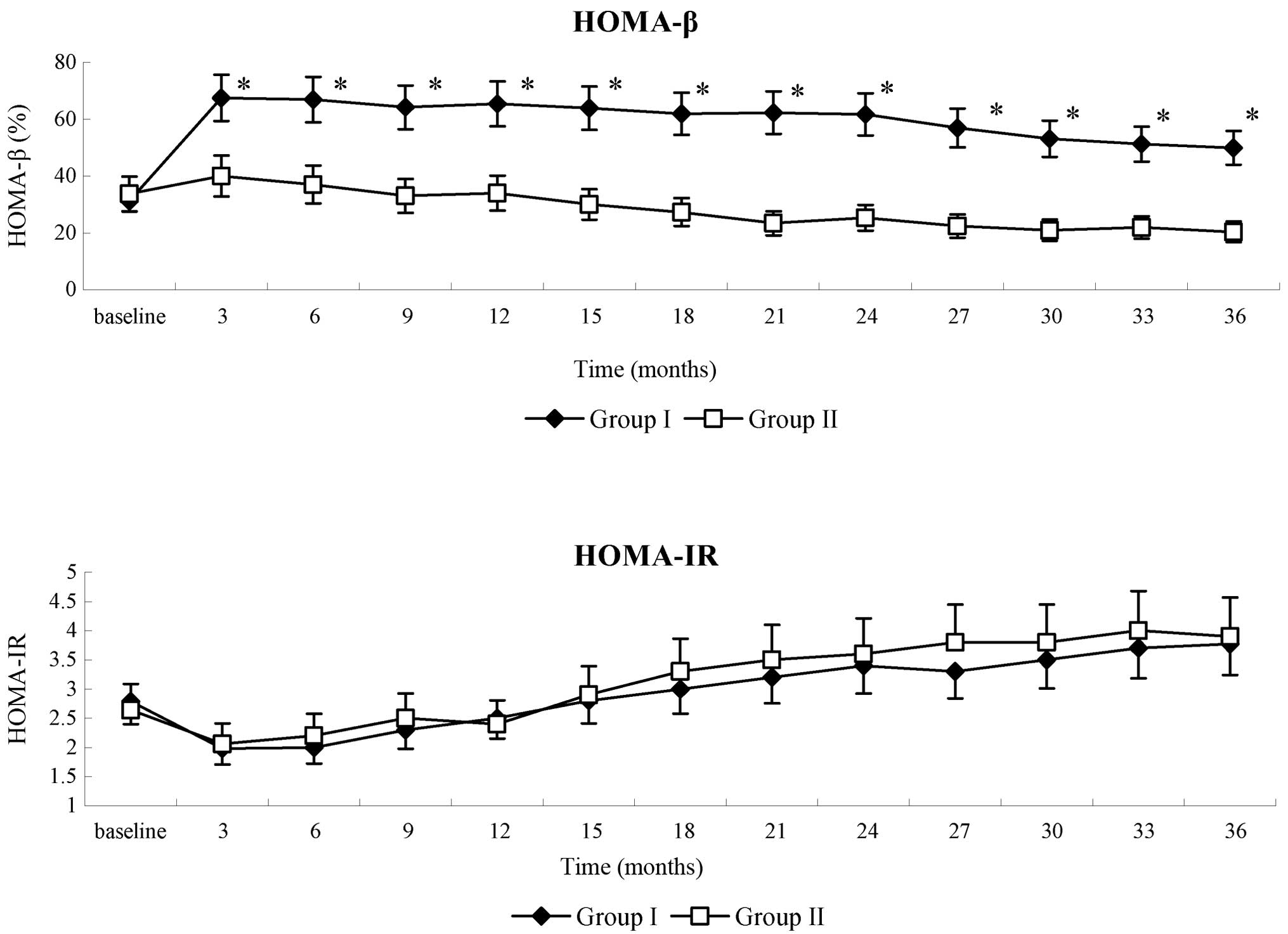 The levels of fasting glucose and C-peptide of patients in the two groups were all within HOMA limits. HOMA-β in group I patients significantly increased during the follow-up period, as compared with the baseline (P<0.05); whereas in group II patients, HOMA-β gradually decreased. There were significant differences in HOMA-β between the two groups (P<0.05; Fig. 4). HOMA-IR was also evaluated in the present study. Although a decrease in HOMA-IR was detected in group I patients between 18 and 33 months post-therapy, as compared with the group II patients, the difference in HOMA-IR between two groups was not statistically significant. HOMA-IR in group II patients gradually increase throughout the follow-up period (Fig. 4). These results suggested that WJ-MSC infusion could enhance the function of islet β-cells in T2DM patients.