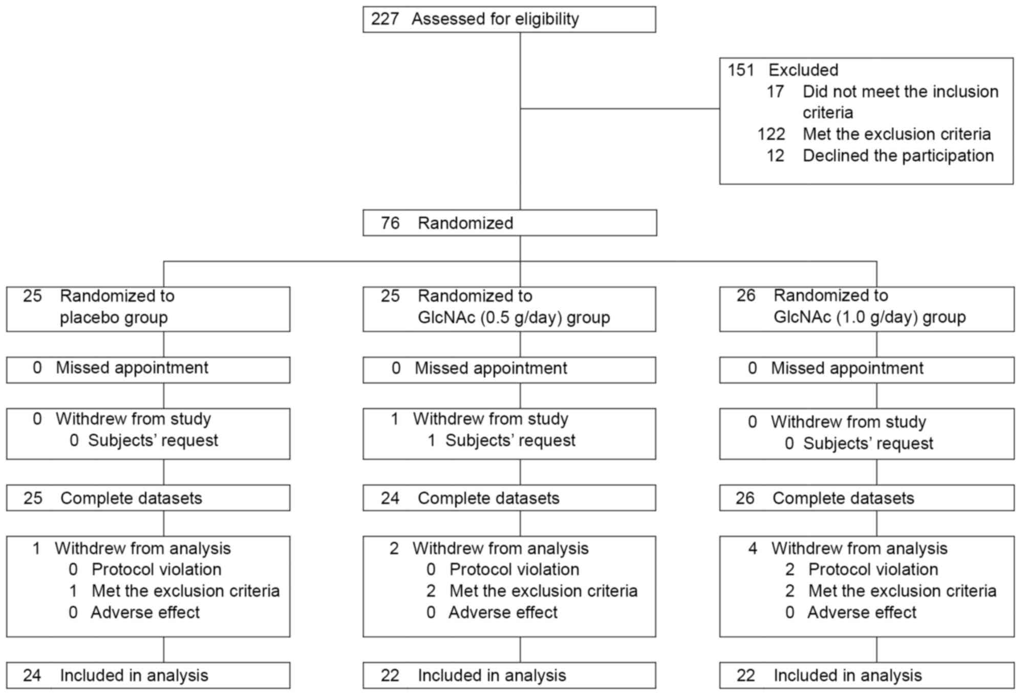 A randomized, placebo-controlled, parallel-group comparative study was designed to assess the efficacy and safety of GlcNAc supplementation. The study was performed between October 2013 and August 2014, and involved four clinical service organization centers under the control of five medical investigators in Japan. The study protocol was approved by the local Ethics Committee (Tana Orthopedic Clinic, Kanagawa, Japan), and was conducted in accordance with the principles of the amended Declaration of Helsinki and ‘Ethical Guidelines for Epidemiological Research’ (recognized by the Japanese Government in 2008, accessible from: http://www.mhlw.go.jp/general/seido/kousei/i-kenkyu/ekigaku/0504sisin.html). Written informed consent was obtained from all participants prior to enrollment in the study. The overall design of the study consisted of a 16-week intervention period and 4-week post-intervention period. The subjects, who accomplished full clinical and laboratory examinations at the baseline, at weeks 4, 8, 12 and 16 during the intervention period, and at week 4 of post-intervention period, were analyzed.