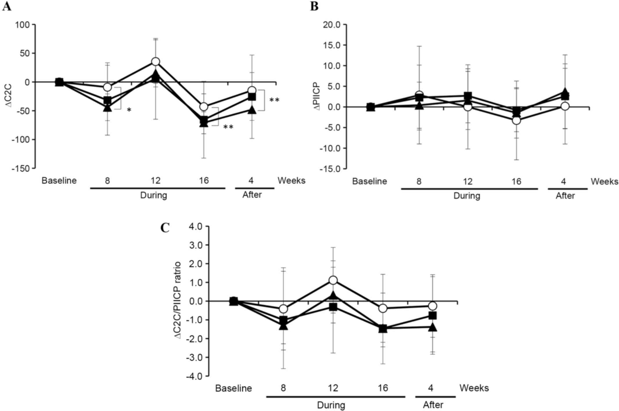 Fluctuations in the levels of C2C, PIICP and C2C/PIICP at 8, 12 and 16 weeks during the intervention and 4-week post-intervention are demonstrated in Fig. 2. Minor changes in the C2C levels of the placebo and the two GlcNAc (500 mg and 1,000 mg/day) groups (Fig. 2A) were observed. In contrast, the PIICP levels in the placebo group were substantially decreased, although the changes were not statistically significant, at 12 and 16 weeks during the intervention, compared with the two GlcNAc groups and returned to the same level as that of the two GlcNAc groups at four weeks after the intervention (Fig. 2B). Moreover, the C2C/PIICP ratio was marginally decreased at 16 weeks during the intervention in the GlcNAc (500 mg/day) group when compared with the placebo and GlcNAc (1,000 mg/day) groups (Fig. 2C).