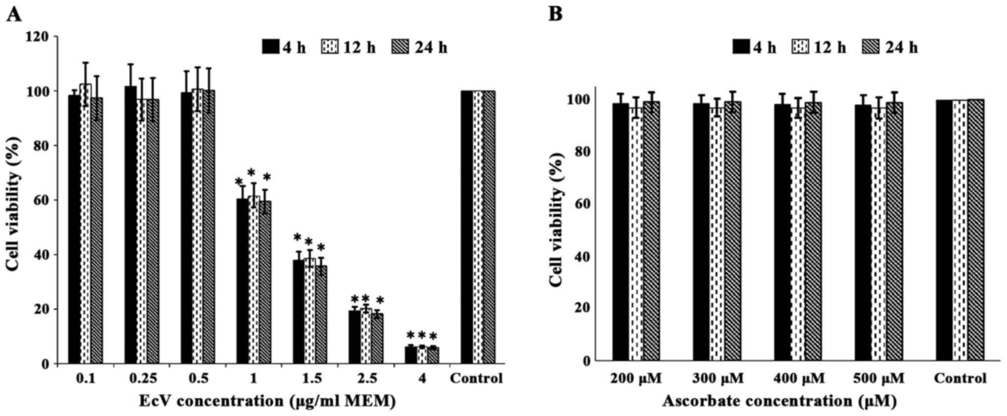 Analysis of variance followed by post hoc Tukey HSD test were performed to evaluate statistical differences between mean ± SD values of all parameters assayed in control venom-free cultures against those incubated with different concentrations of EcV, Asc and EcV plus Asc for different periods. This was done using the SPSS version 17.0 software (SPSS, Inc., Chicago, IL, USA). P<0.05 was considered to be statistically significant.
