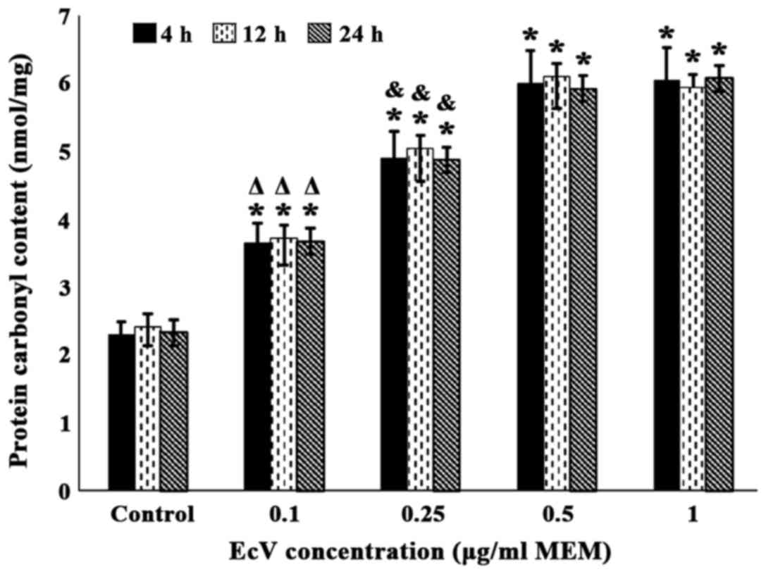 In this experiment routine MEM of confluent passage 5 cultures (n=10) was replaced with serum-free media containing 0.10, 0.25, 0.50 and 1.00 µg EcV/ml and cells further incubated with these media for 4, 12 and 24 h. Fibroblasts were then harvested, pelleted and sonicated as described earlier and protein carbonyl content (PCC) were assayed as described later. PCC was chosen to serve as a biomarker of the oxidative status of cultures at increasing EcV concentrations and incubation periods.