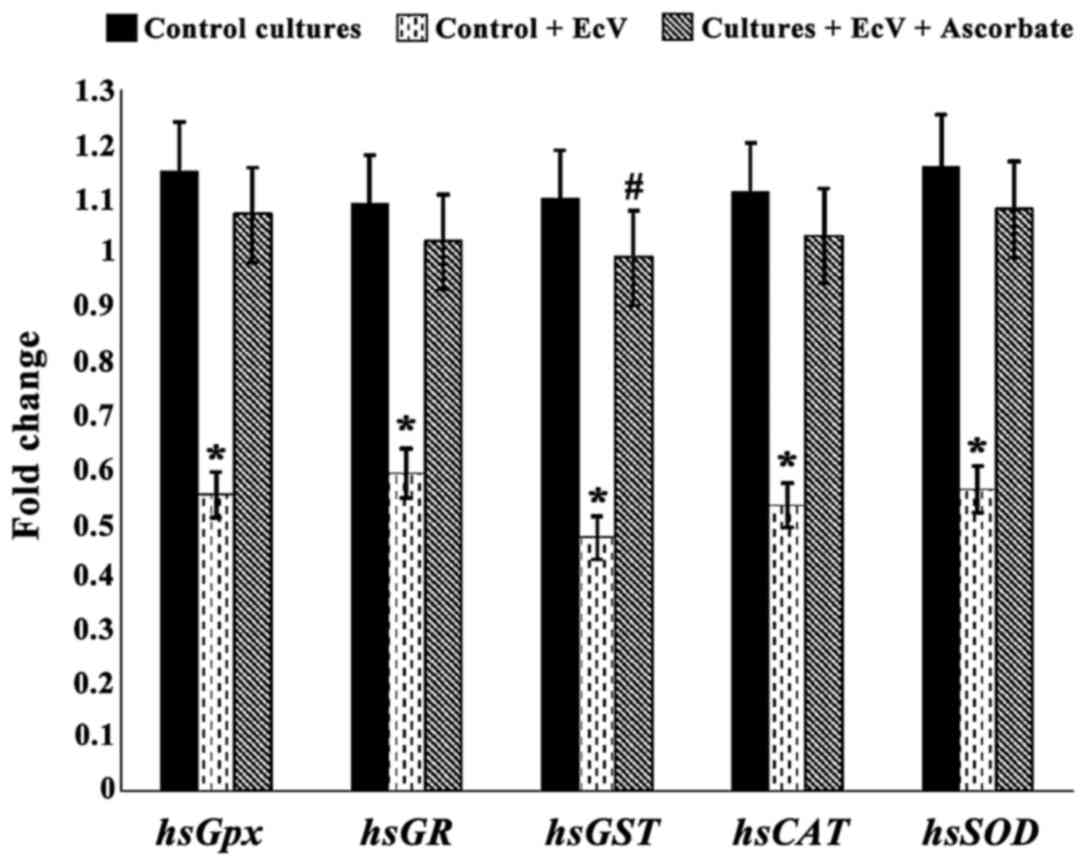 In light of the present study findings, it is concluded that incubation of EcV-treated cultures with high Asc concentrations (400 or 500 µM) acted to scavenge ROS thus preventing OS and helped to aleviate DNA damage and the downregulation of antioxidant gene expression levels. Asc could have also acted to aleviate ROS-related DNA damage possibly causing downregulation of the expression levels of genes responsible for the synthesis of the hsSVCT1 and hsSVCT2 transporter proteins.