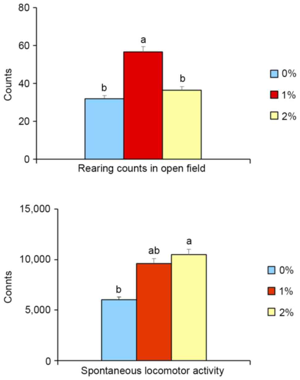 In the open-field test, the rearing activity of animals in the 1%-ethanol group was significantly higher (+77%, P<0.05) than for the control and 2%-ethanol groups. There was no difference in activity between control and 2%-ethanol groups (Fig. 1), indicating that exploratory activity (index of seeking behavior) was increased in the 1%-ethanol group. Moreover, 2%-ethanol intake significantly elevated (+75%, P<0.05, Fig. 1) spontaneous locomotor activity, whereas 1%-ethanol intake did not increase such activity, implying the vitality of 2% ethanol-treated mice. The animals allowed free access to food and drinking, mainly from 01:00 p.m. to 08:00 p.m. in the dark period in this study, which was confirmed by drink sensor measurements (Table IV). The open-field test was conducted from 01:00 p.m. to 03:00 p.m., and it is unclear that the effects of ethanol exposure on the behavioral parameters are direct or indirect effects.