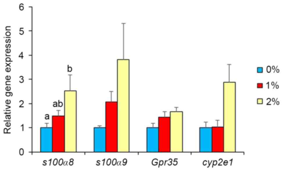 Gene expression analysis revealed significantly higher levels of brain S100a8 in the 2%-ethanol group, but not in the 1%-ethanol group. S100a9, GPR35 and Cyp2e1 expressions also tended to be higher in the 2%-ethanol group. S100a8 and S100a9 have been suggested to be involved in inflammatory signaling (25), and GPR35 is proposed to be associated with inflammation (26). Cyp2e1 is considered a source of reactive oxygen species generation (27). Thus, the dose of 2% ethanol appears to be necessary for the induction of expression of the factors responsible for inflammation and oxidative stress.