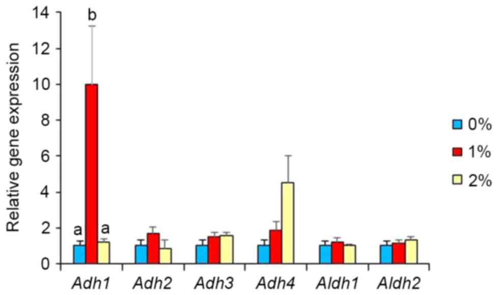 We obtained preliminary measurement data for serum ethanol when dissected (01:00 p.m. to 03:00 p.m.) at 23-week-old, noting that no differences were observed among the three groups (Kimoto et al, unpublished data). At present, there are no supporting data from the literature to suggest what blood or brain ethanol concentrations may have been reached in this model as a result of the 1 and 2% ethanol treatments. It has been reported that consumption of 6% ethanol containing liquid diet by C56BL6 mice for 22 weeks permits the use of plasma ethanol as a confirmation of alcohol exposure model (35). Meanwhile, plasma ethanol levels of the mice fed 3% ethanol containing liquid diet did not significantly differ from the base line levels of mice without receiving ethanol (35).
