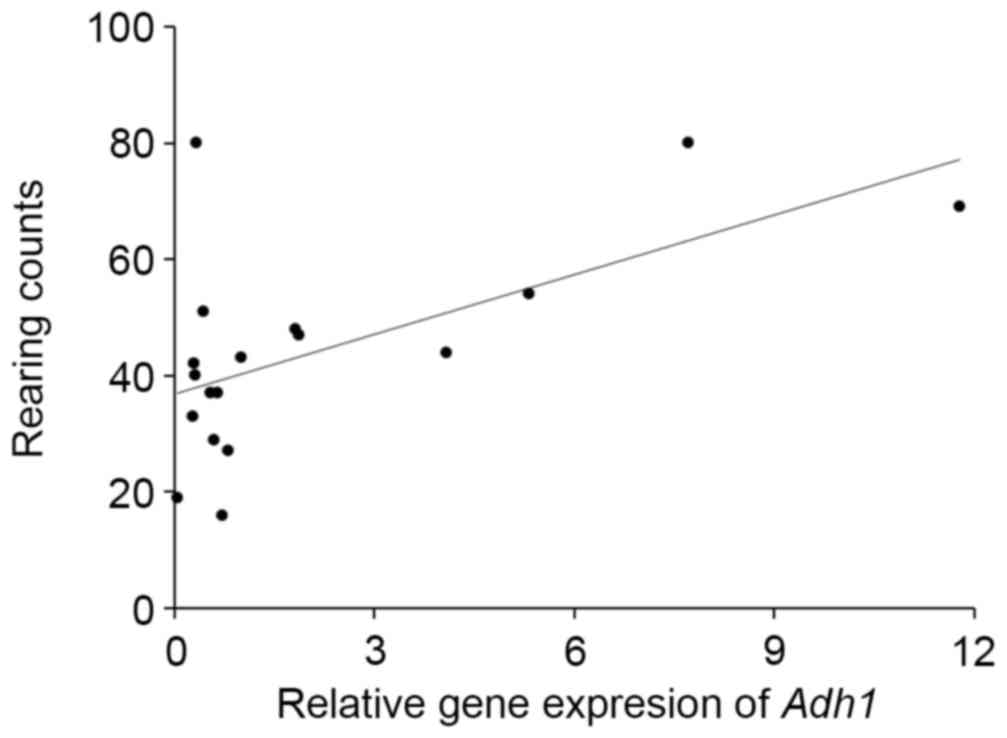 Surprisingly, our study quantified a marked elevation in gene expression in brain tissue for Adh1 in the 1%-ethanol group, but not in the 2%-ethanol group. Alcohol dehydrogenases (ADHs) metabolize a broad spectrum of substrates such as alcohols and aldehydes endogenously produced during lipid peroxidation so as to prevent the possible toxic accumulation of these compounds (28). Because these compounds can be harmful to dopaminergic neurons, ADHs have attracted attention. Genetic variants in ADH1C have been reported to be associated with Parkinson disease (29). In fact, recent study using Adh1 knockout mice has shown lack of Adh1 leads to changes in dopamine neurons related behavior (30). Furthermore, Adhs are a critical mediator of retinoic acid synthesis from vitamin A (31,32). Retinoic acid has been suggested a protective factor against neurodegenaration via retinoid signaling (33). Our studies further indicated Adh1 expression is significantly correlated with the rearing activity. Expression of several olfactory receptor genes was also higher in the 1%-ethanol group compared with other groups. An Alzheimer's disease model rat revealed down regulation of olfactory receptor genes in the olfactory bulb (34) and olfactory dysfunction has been also reported in neurodegerative disorders such as Alzheimer's and Parkinson's diseases. Olfactory dysfunction also increases with aging. In view of these facts, it will be necessary to evaluate if perturbed expression of Adh1 expression leads to the alterations in the rearing activity. Furthermore, the elevation of Adh1 expression requires confirmation at the protein level and is being investigated in future studies.