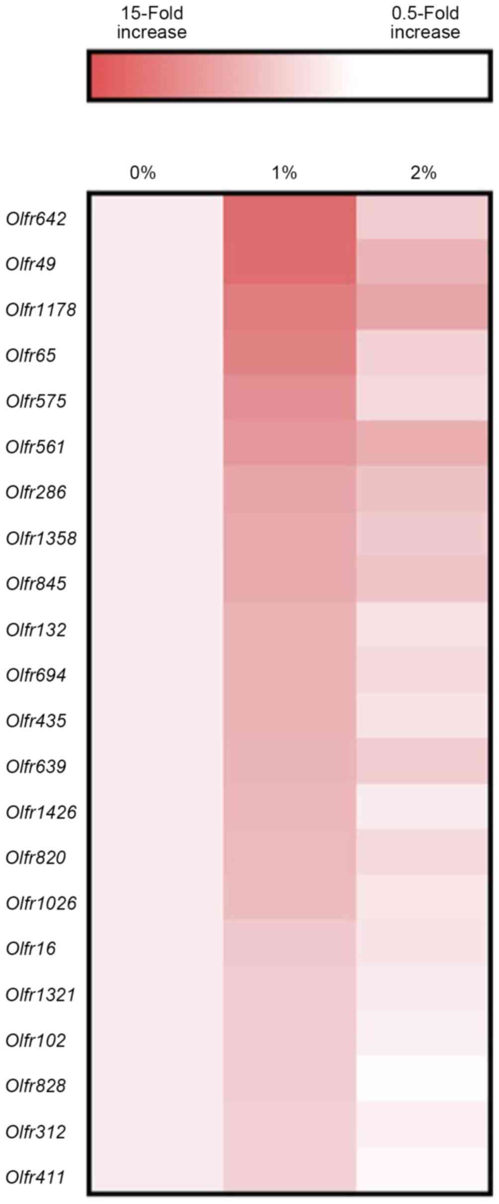 In our preliminary study, DNA microarray analysis indicated alterations in the gene expression of S100a8, S100a9, GPR35, Cyp2e1, Adh1, and Adh4 by ethanol intake. Thus, real-time PCR analysis was used in the present study to confirm these results. Gene expression of other ethanol-metabolizing enzymes was also determined. Intake of 2% ethanol resulted in a 2.5-fold elevation (P<0.05; Fig. 2) of S100a8 mRNA, but 1%-ethanol intake did not. S100a9, GPR35 and Cyp2e1 expression levels were unaffected in the 2%-ethanol intake group. Intake of 1% ethanol caused a marked elevation (10-fold, P<0.05; Fig. 3) in Adh1 expression, but that of 2% ethanol did not. Intake of 1 and 2% ethanol caused no influence on Adh2, Adh3, Adh4, Aldh1, and Aldh2 expression (Fig. 3). Adh1 expression was significantly correlated with the rearing activity of the mice (r=0.598, P<0.01; Fig. 4) and with the total senescence score at 22 weeks (r=−0.497, P<0.05), but not with the total senescence score at 25 weeks (r=−0.412, P=0.09). The expression of Adh1 was not correlated (P>0.05) with any of the serum factors or behavioral results, with the exception of rearing activity. In addition, the serum results were not correlated with the rearing activity and total senescence scores (P>0.05). Adh2, Adh3, Aldh1 and Aldh2 expression levels were unaffected by ethanol intake. DNA microarray analysis also indicated the elevated gene expression of several olfactory receptors as a consequence of 1% ethanol intake (Fig. 5).