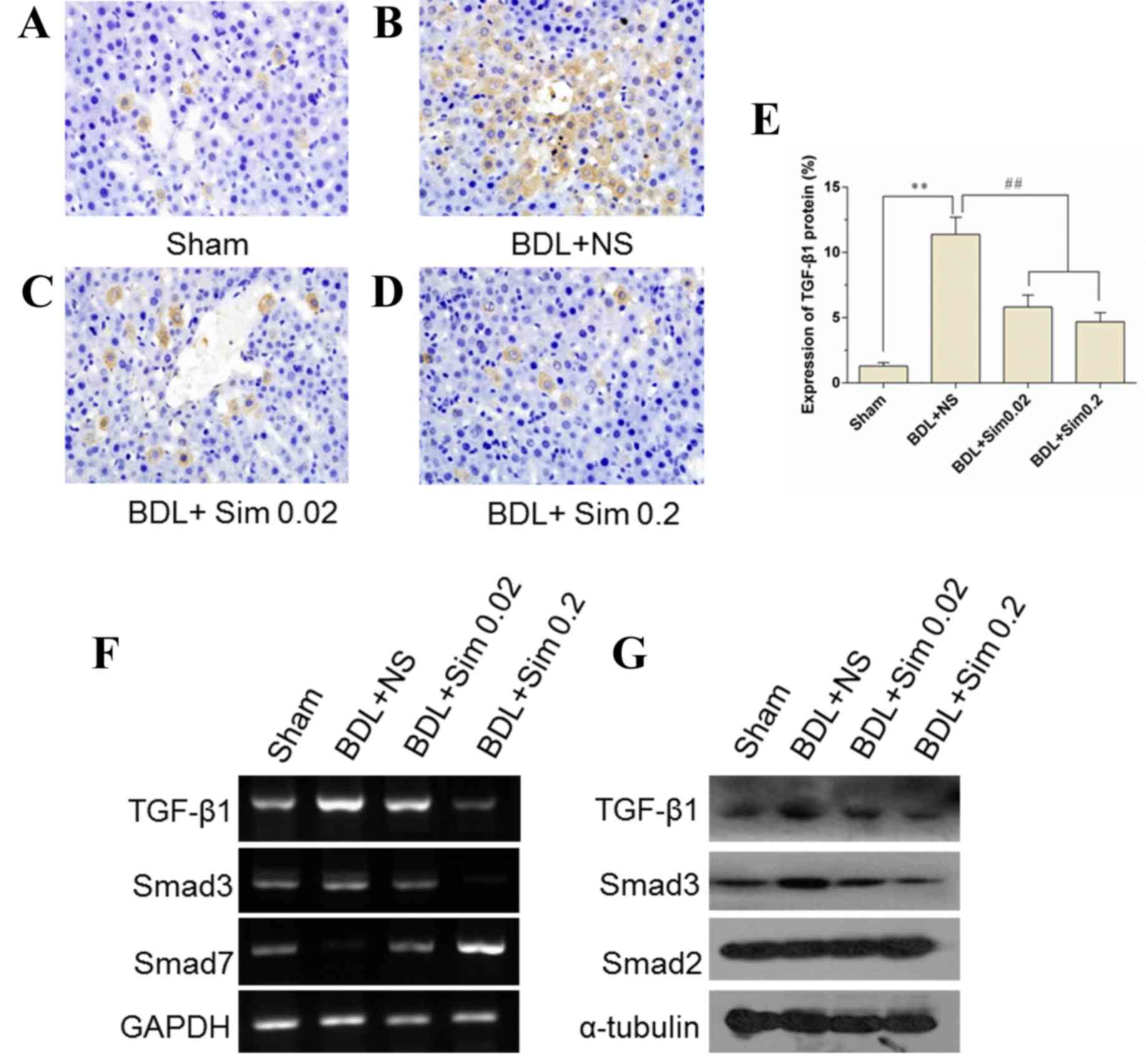In conclusion, the data of the present study provide evidence on the mechanism of how Sim blunts profibrotic TGF-β1 signaling. There is a causal association between Sim administration and the TGF-β1 signaling pathway following BDL. Moreover, the addition of Sim abrogates the harmful hepatocyte apoptosis and beneficially augments hepatic regeneration during obstructive jaundice progression. In addition, this mechanism may provide the clues to improved ways that will ameliorate the complication of liver damage and reduce the morbidity and mortality of obstructive jaundice.
