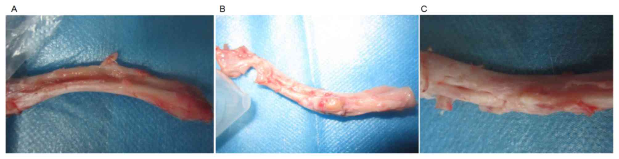 Rabbits were provided with food 12 h after surgery in each group. The incisions healed within 1 week without severe infection, reddening or festering. At 1 week after surgery, the rabbits in groups A and B appeared to be more active compared with those in group C, while the mobility was moderate in all groups 3 weeks later. As indicated by pathological observation, the scaffolds in groups A and B at 4 weeks after surgery were enclosed in fibrous connective tissues. The scaffolds under the periosteum presented signs of calcification and a grayish white color. Little difference was observed between groups A and B with the naked eye. At 8 weeks, the scaffold was gradually replaced by bony calluses in groups A and B. The scaffolds of group B had a light yellow color. Between weeks 12 and 16, osseointegration with a similar color and texture as that of the normal bone tissues was observed in group A. In group B, the scaffolds had a light yellow color, similar to that of the cartilage. Although the broken ends of the bone presented slight elongation at the early stage in group C, no osseointegration was observed and the defect was filled with soft tissues during the entire observational period. Fig. 1 shows the radial bone defect of each group at 16 weeks after surgery.