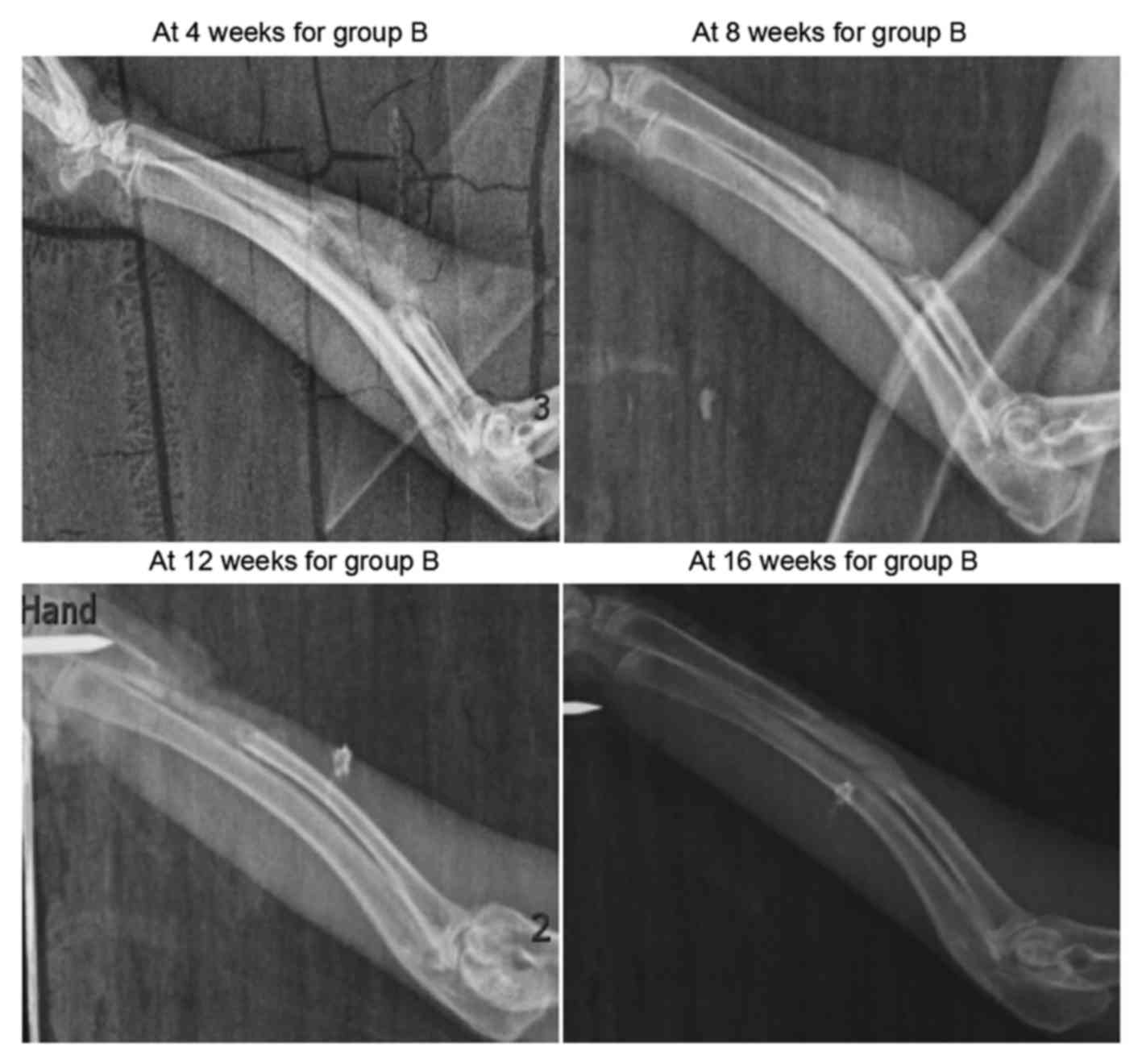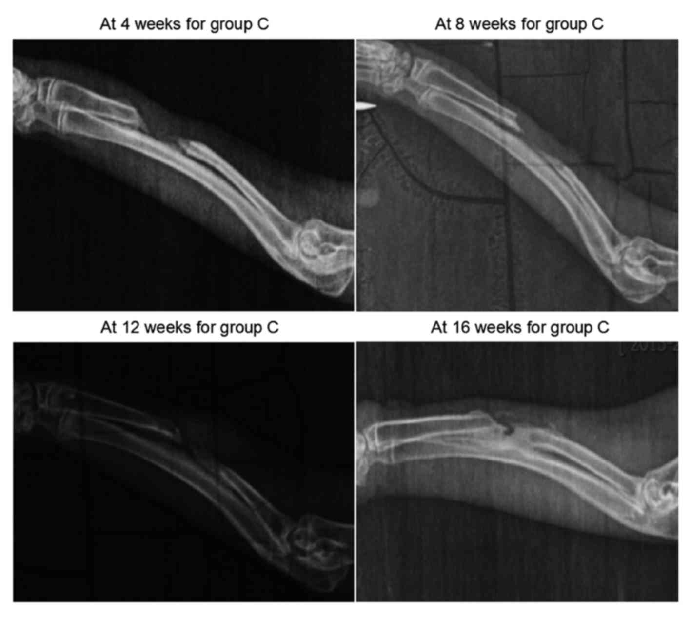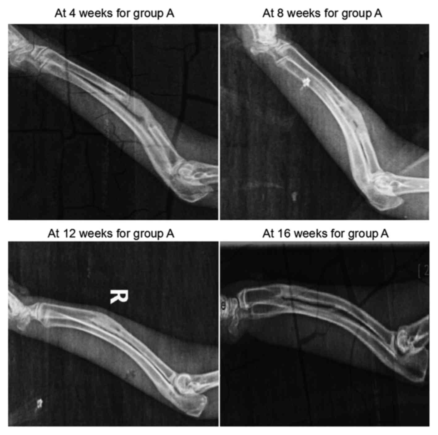 The results of X-ray examination conducted in group A are shown in Fig. 2. At 4 weeks after surgery, the scaffolds in the defect region presented with a grayish white high-density shadow. At 8 weeks after surgery, the calcified shadow was darkened with distinct boundary from the surrounding soft tissues. At 12 weeks, the marrow cavity was unobstructed partially between the two broken ends. Finally, at 16 weeks, no evident disparity was observed on the X-ray scans between the defect region and the normal bone tissue, while the marrow cavity was completely unobstructed.