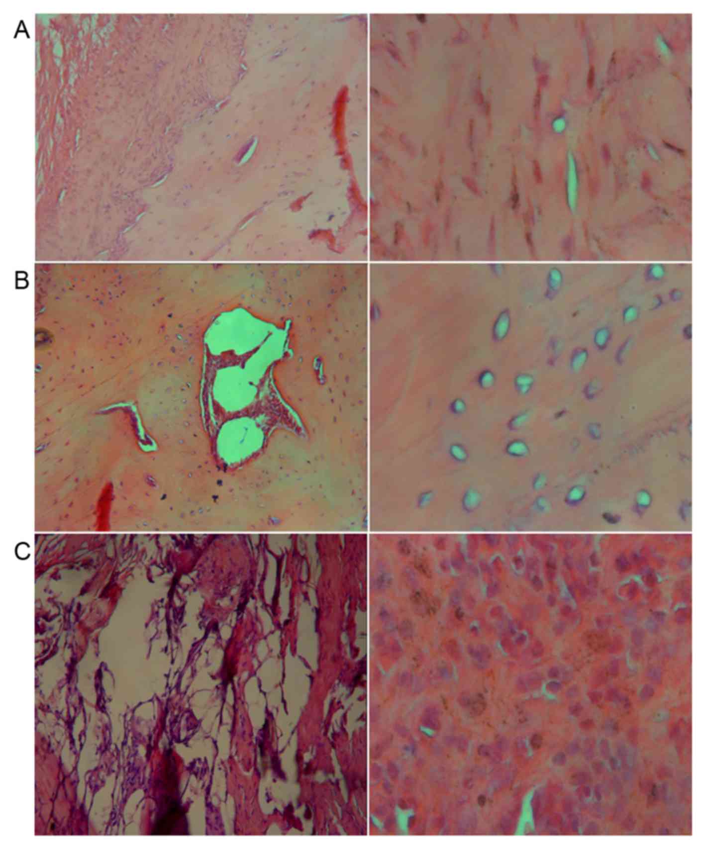 The results of rough observation, X-ray scan and pathological observation were analyzed using SPSS version 17.0 software (SPSS, Inc., Chicago, IL, USA). F-test was conducted to compare the mean values of multiple samples. Differences with P<0.05 were considered to be statistically significant.