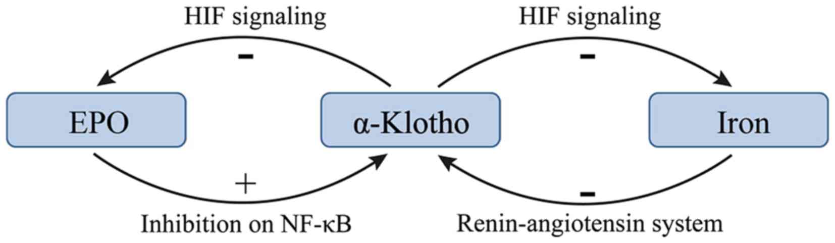 Klotho (KL) was originally identified as an anti-aging gene, which when overexpressed extended the lifespan of mice (6). The KL gene encodes a single-pass transmembrane protein, and is expressed in the kidney and parathyroid gland (7). Furthermore, the KL protein functions as an obligate subunit of the receptor for fibroblast growth factor 23 (FGF23) (8). FGF23 is a hormone secreted by osteocytes and osteoblasts, which acts on renal tubular cells to promote phosphate excretion into the urine and suppress the synthesis of the active form of vitamin D [1,25-dihydroxyvitamin D3; 1,25(OH)2D3] (9). Growing evidence suggests that α-KL is a significant marker for CKD (10,11) and a pathogenic factor in the progression of CKD progression (12,13). A recent study has reported that decreasing α-KL levels are associated with the occurrence of anemia in patients with CKD (14). The present study reviews the recent advances in understanding of the role served by α-KL in the development of anemia in patients with CKD, and summarizes novel approaches for the clinical treatment of anemia in CKD.