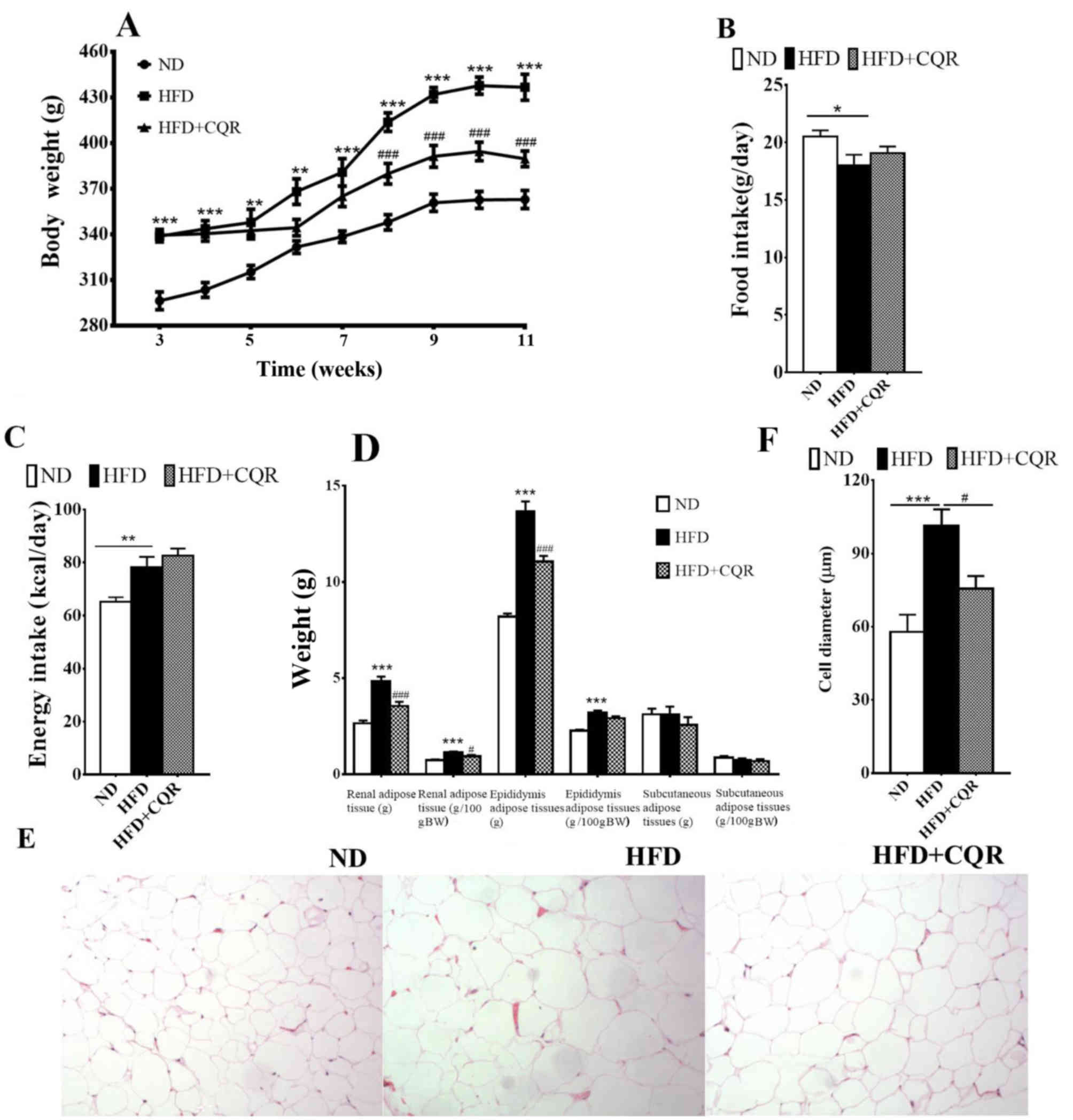 After 3 weeks, at the point of CQR intervention, the body weight of rats in the HFD group was significantly higher than those in the ND group (Fig. 1A). The body weight increase was alleviated by CQR between weeks 8 and 11 and following 11 weeks intervention; HFD+CQR rats had a significantly lower body weight than HFD rats (Fig. 1A). Food intake was significantly lower in HFD rats compared with ND rats (Fig. 1B), however energy intake was significantly higher (Fig. 1C). CQR did not exert a marked effect on food and energy intake. At the end of week 11, HFD+CQR rats had a notably lower visceral (epididymal and perirenal) adipose tissue weight (Fig. 1D) and a significantly smaller adipose cell diameter compared with the HFD group (Fig. 1E and F). Subcutaneous adipose tissue weight did not differ significantly across all groups (Fig. 1D). These results suggest that CQR treatment may inhibit HFD-induced obesity.