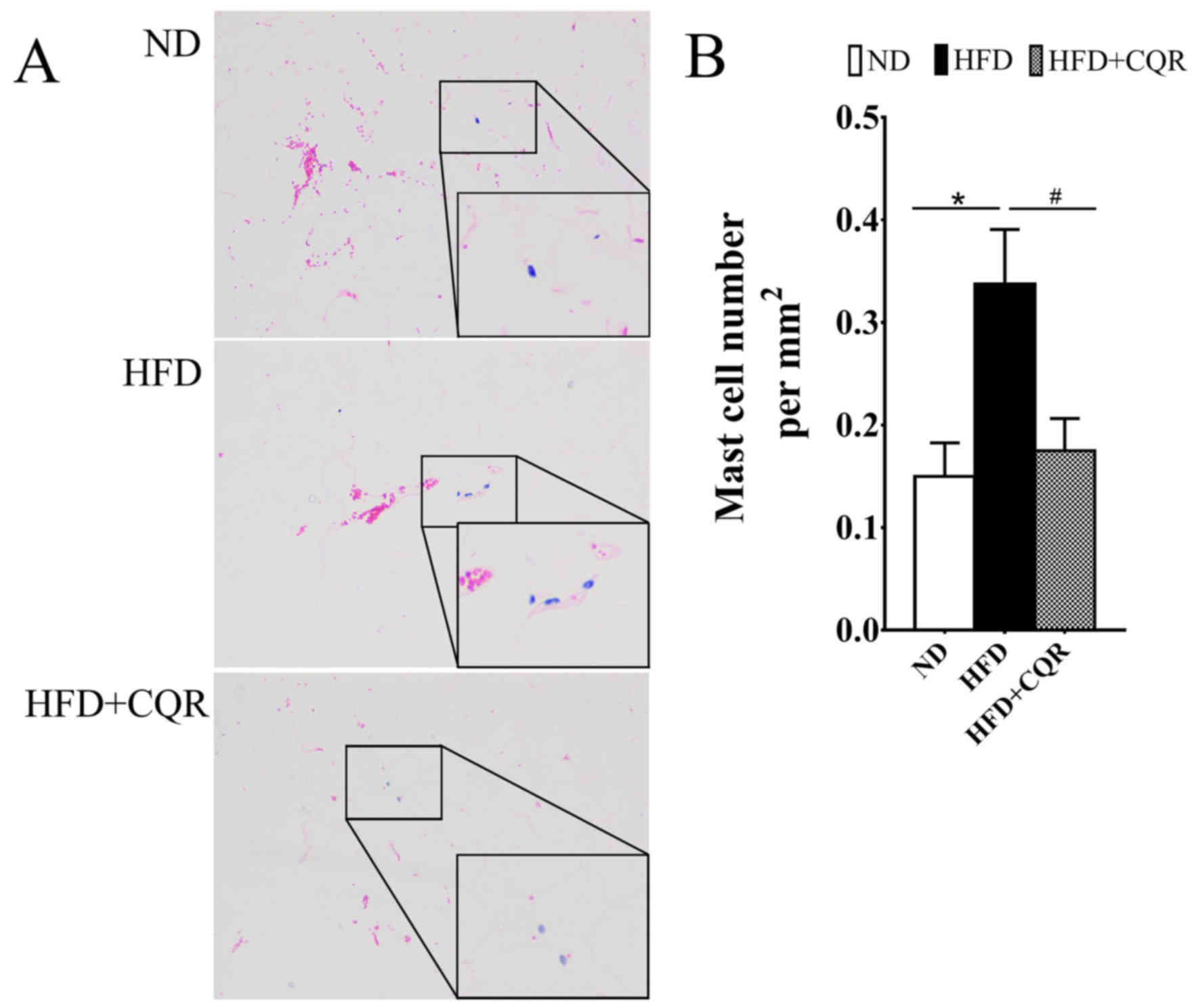 During the formation of HFD induced-obesity and exacerbation of adipose tissue inflammation or insulin resistance, a large amount of mast cells infiltrate the adipose tissue (17). It was reported that HFD induced mast cell clustering in WAT and promoted obesity and insulin resistance (18), while quercetin suppresses the release of cytokines from mast cells in vitro and obesity mice (16,19). The number of mast cells in EAT was calculated to evaluate the effects of CQR on mast cell in adipose tissue of HFD-induced rats (Fig. 2). The results demonstrated that HFD significantly promoted the transition of mast cells into EATs, while CQR significantly reversed this effect (both P<0.05).