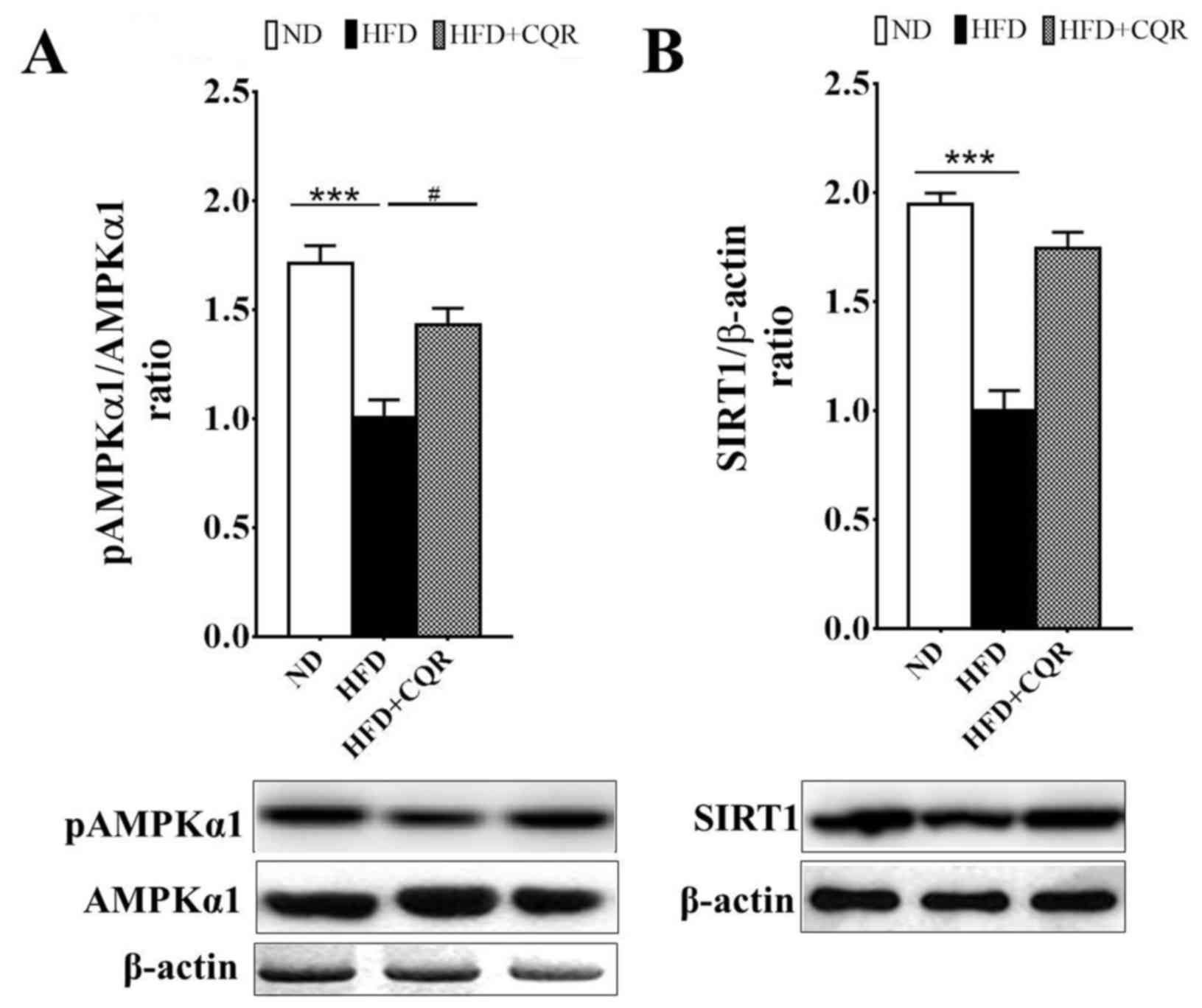 AMPKα1 and SIRT1 are two key nutrient sensors linking nutrient metabolism and inflammation (21–22). AMPKα1 negatively regulates lipid-induced inflammation, which acts through SIRT1 to protect against obesity, inflammation and insulin resistance (23). It has been demonstrated that quercetin alleviates obesity-associated adipose tissue macrophage infiltration and inflammation in mice via the AMPKα1/SIRT1 signaling pathway (16). Resveratrol also induces beneficial effects on obesity and metabolic disturbances by activating the AMPKα1/SIRT1 signaling pathway (24). Consistent with previous studies, AMPKα1 phosphorylation (Fig. 3A) and SIRT1 expression (Fig. 3B) in the EAT of rats fed a HFD were significantly suppressed. Treatment with CQR significantly reversed the suppression of AMPKα1 phosphorylation in a rat model (Fig. 3A).