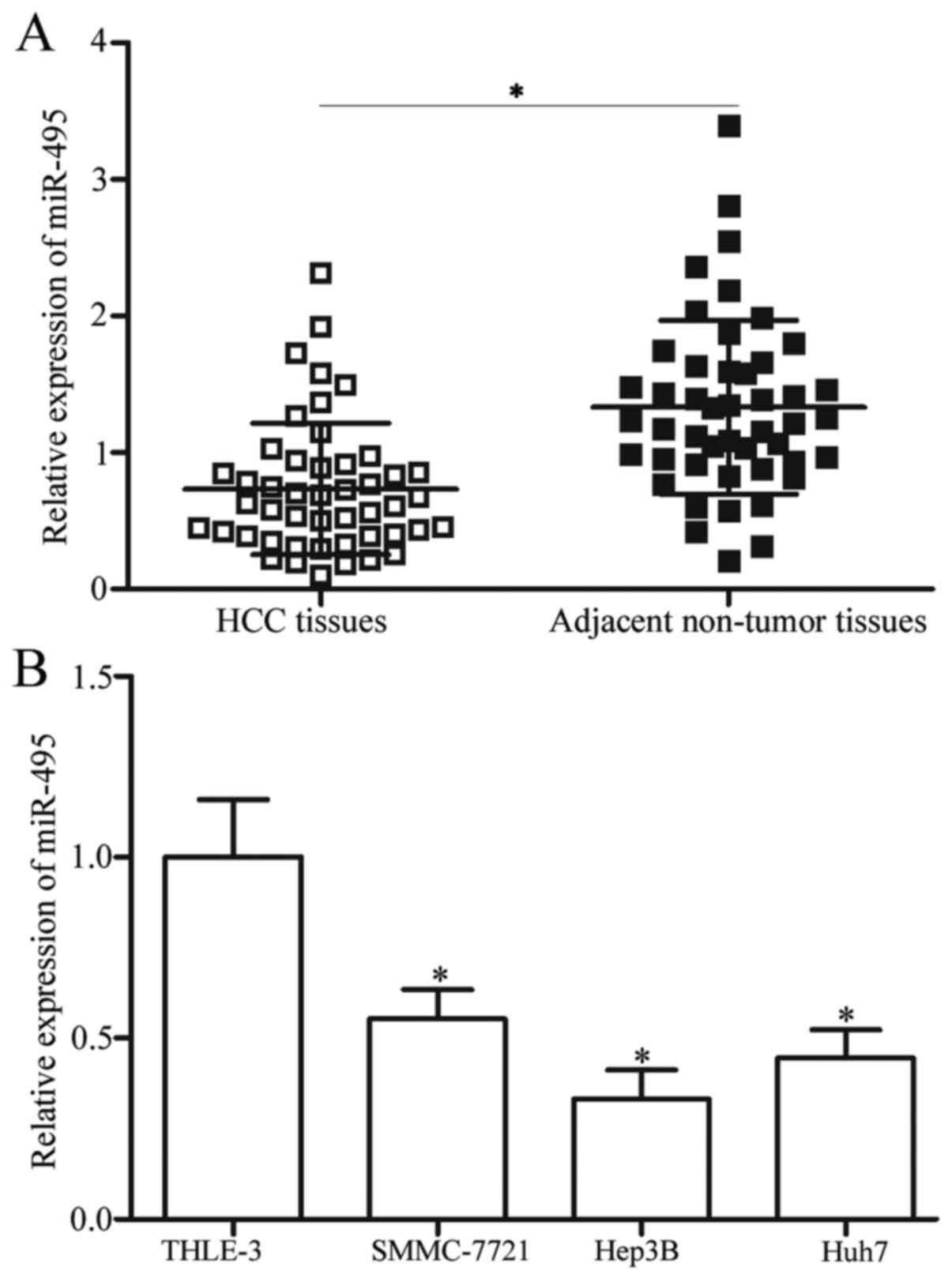 To determine the potential roles of miR-495 in HCC, RT-qPCR was performed to detect miR-495 expression levels in 47 primary HCC tissues and matched adjacent non-tumour tissues. Our results demonstrated that miR-495 was significantly downregulated in HCC tissues compared with that in matched adjacent non-tumour tissues (P<0.05; Fig. 1A). The miR-495 expression was also examined in three HCC cell lines, namely, SMMC-7721, Hep3B and Huh7, and in immortalized normal liver epithelial cell line, namely, THLE-3. In Fig. 1B, the miR-495 expression levels in the four HCC cell lines were lower than that of THLE-3 (P<0.05). Among these HCC cell lines, Hep3B yielded the lowest miR-495 expression levels and thus were selected for further functional studies. These results suggested that miR-495 may be involved in the formation and progression of HCC.
