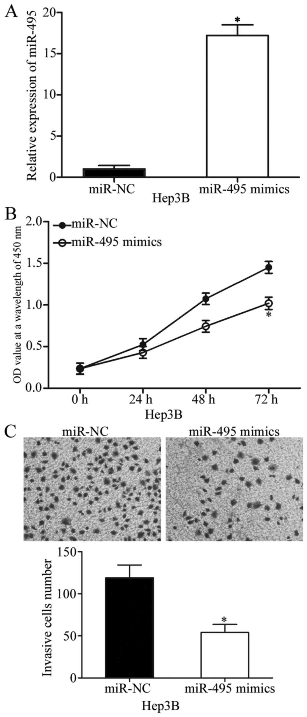 Hep3B cells were transfected with miR-495 mimics or miR-NC to examine the effects of miR-495 on the biological characteristics of tumours. Transfection efficiency was determined through RT-qPCR, and the results indicated that miR-495 was markedly upregulated in Hep3B cells transfected with miR-495 mimics (P<0.05; Fig. 2A). CCK-8 assay was conducted to verify the effect of miR-495 overexpression on HCC cell proliferation. In Fig. 2B, upregulation of miR-495 inhibited Hep3B cell proliferation (P<0.05). Cell invasion assay was also performed to show the effect of miR-495 on HCC cell invasion abilities. The results demonstrated that the restored miR-495 expression reduced the invasive capabilities of Hep3B cells (P<0.05; Fig. 2C). These results illustrated the tumour-suppressive effects of miR-495 on HCC cell proliferation and invasion.