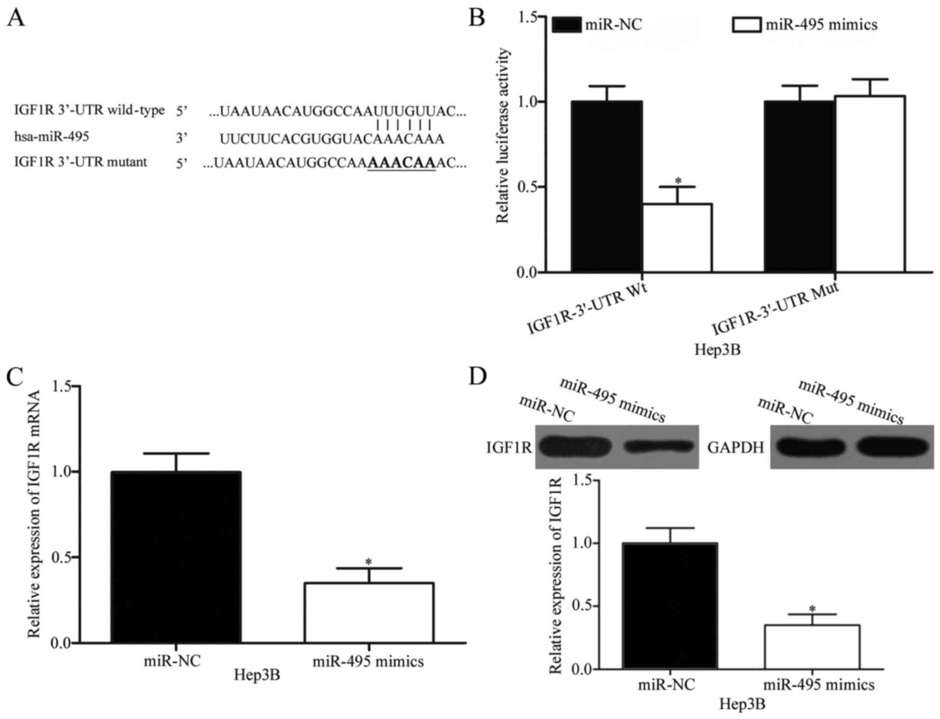 To investigate the mechanisms by which miR-495 plays its tumour-suppressing roles in HCC, bioinformatics analysis was conducted to predict the candidate targets of miR-495. IGF1R, which is highly expressed in HCC and possibly involved in HCC formation and progression (24,25), was predicted as a potential target of miR-495 (Fig. 3A) and consequently selected for further experimental validation. To confirm this hypothesis, we carried out a luciferase reporter assay in Hep3B cells co-transfected with wild-type or mutant 3′-UTR of IGF1R plasmid and miR-495 mimics or miR-NC. In Fig. 3B, ectopic miR-495 expression significantly decreased the luciferase activity of pMIR-IGF1R-3′-UTR Wt in Hep3B cells (P<0.05) but did not affect the luciferase activity of pMIR-IGF1R-3′-UTR Mut. To confirm whether IGF1R is a direct target of miR-495, we performed RT-qPCR and Western blot analysis and then determined the regulatory effects of miR-495 on endogenous IGF1R expression in HCC cells. RT-qPCR and Western blot analysis revealed that the restored miR-495 expression suppressed the IGF1R expression in Hep3B cells at mRNA (P<0.05; Fig. 3C) and protein (P<0.05; Fig. 3C) levels. These results suggested that IGF1R is a direct target of miR-495 in HCC.