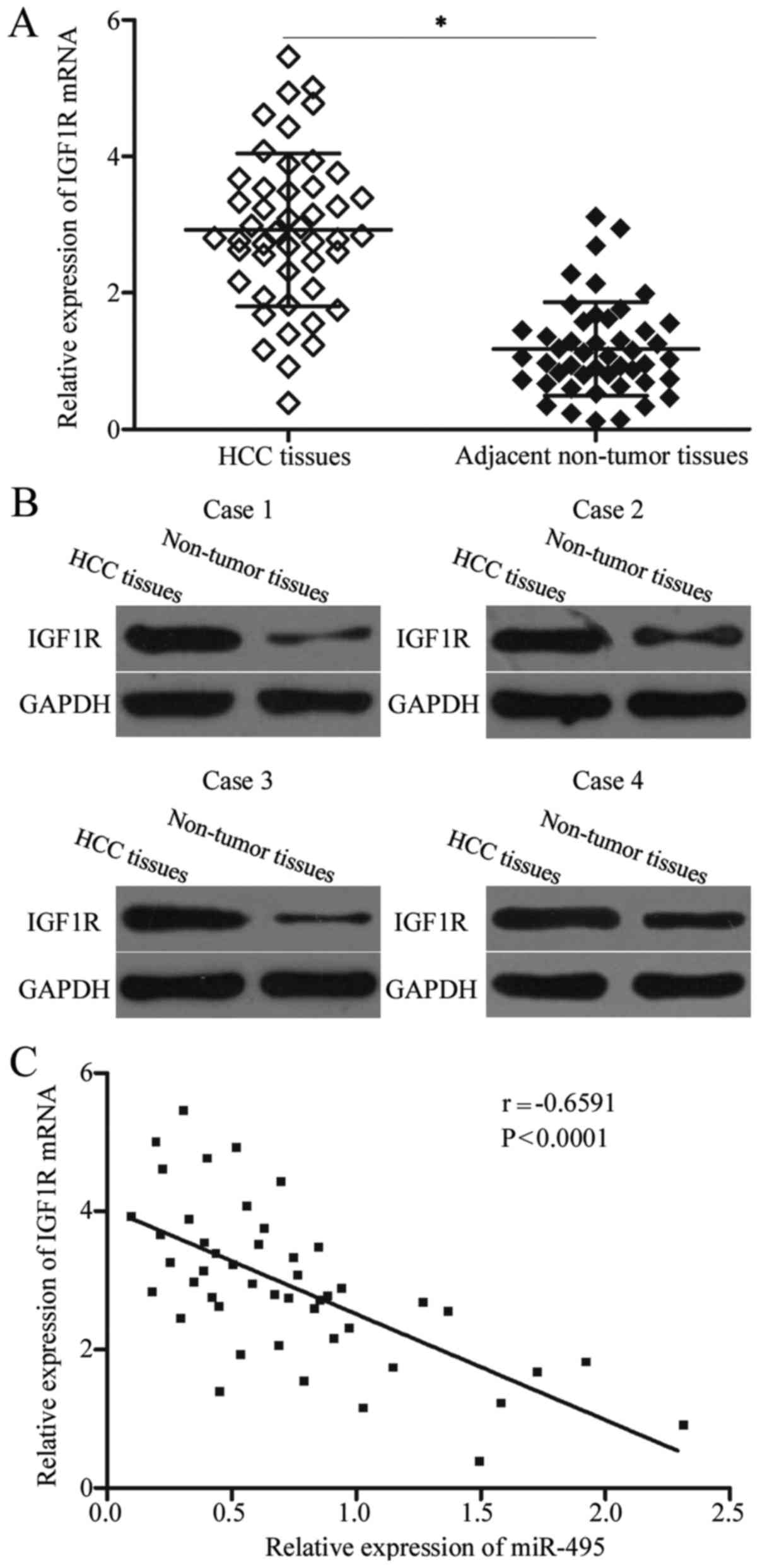 Total RNA was isolated from tissue specimens or cells using TRIzol reagent (Invitrogen; Thermo Fisher Scientific, Inc., Waltham, MA, USA) in accordance with the manufacturer's instructions. For miR-495 quantification, complementary DNA (cDNA) was synthesized from 1 µg of total RNA using the TaqMan microRNA Reverse Transcription kit (Applied Biosystems, Foster City, CA, USA). Quantification of miR-495 was performed using a TaqMan microRNA Assay kit (Applied Biosystems; Thermo Fisher Scientific, Inc.). U6 small nuclear RNA was used as an endogenous control. To quantify IGF1R mRNA, corresponding cDNA was obtained form total RNA with a PrimeScript RT Reagent kit (Takara Biotechnology, Co., Ltd., Dalian, China), according to the manufacturer's protocols. The quantitative PCR was carried out in an Applied Biosystems® 7500 Real-Time PCR system (Applied Biosystems; Thermo Fisher Scientific, Inc.) using SYBR Premix Ex Taq™ kit (Takara Biotechnology, Co., Ltd.), with GAPDH as an internal control. All reactions were performed in triplicate and fold changes were calculated based on relative quantification using the 2−ΔΔCq method (23).