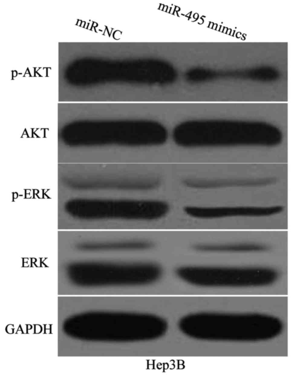 IGF1R likely performs its functions partly by participating in the regulation of AKT and ERK signalling pathways (26–28). To determine whether miR-495 is involved in the regulation of AKT and ERK pathways in HCC, we detected the expression levels of AKT, p-AKT, ERK and p-ERK in Hep3B cells transfected with miR-495 mimics or miR-NC. Western blot analysis demonstrated that miR-495 overexpression reduced the expression of p-AKT and p-ERK in Hep3B cells (Fig. 6). Conversely, the expression of total AKT and ERK in these two cell lines did not significantly change. These results suggested that miR-495 inactivates AKT and ERK signalling pathways in HCC.