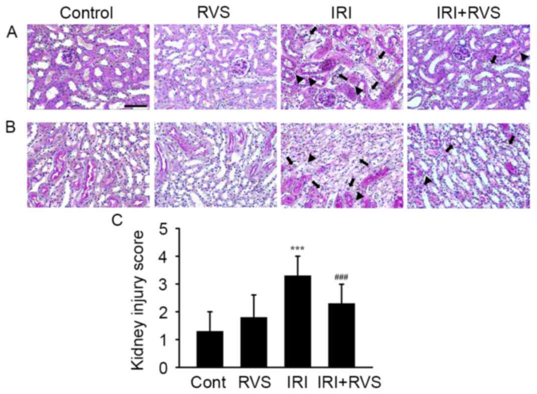 Mice were randomly divided in 4 groups (all n=8): A control group, an RVS-treated group (RVS), an IRI-operation group (IRI) and an IRI-operation group that received pretreatment with RVS (IRI+RVS). Whereas the control group was intraorally administered with 500 µl of distilled water as a vehicle, the RVS group was intraorally administered with RVS (20 mg/kg/day) diluted in the same volume of vehicle over 14 days. For mice in the IRI+RVS group, the same dose of RVS as that administered to mice in the RVS group was applied prior to the IRI operation for the same duration. For mice in the IRI group, the same volume of distilled water was intraorally administered for 14 days prior to the IRI operation.