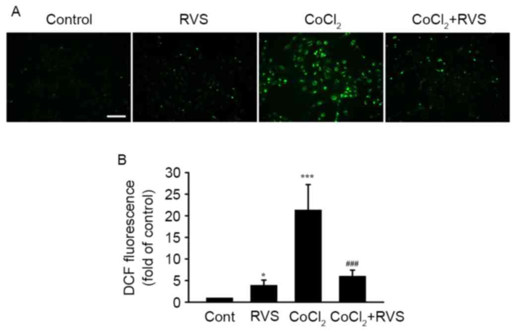 To determine whether antioxidant properties are involved in the protective effect of RVS against CoCl2-induced damage in HK-2 cells, intracellular ROS levels in different cell groups was detected using DCFH-DA. As RVS significantly elevated cell viability even at a dose of 40 µg/ml, this dose was used in the current study. As indicated in a representative fluorescence image (Fig. 5A) and a quantitative graph (Fig. 5B), cells treated with 40 µg/ml RVS for 24 h exhibited significantly higher ROS intensity compared with those in the control group (3.9±1.3 vs. 1.0±0, P<0.05). Cells incubated with 300 µM CoCl2 for 30 min exhibited an even higher ROS intensity compared with the control (21.4±5.9, P<0.001 vs. control). However, cells treated with 40 µg/ml RVS for 24 h and then incubated with 300 µM CoCl2 for 30 min exhibited significantly lower ROS intensity than the CoCl2 group (6.0±1.4 vs. 21.4±5.9, P<0.001). These data suggest that the RVS-mediated protection of HK-2 cells from CoCl2 is at least partly due to the inhibition of ROS generation.