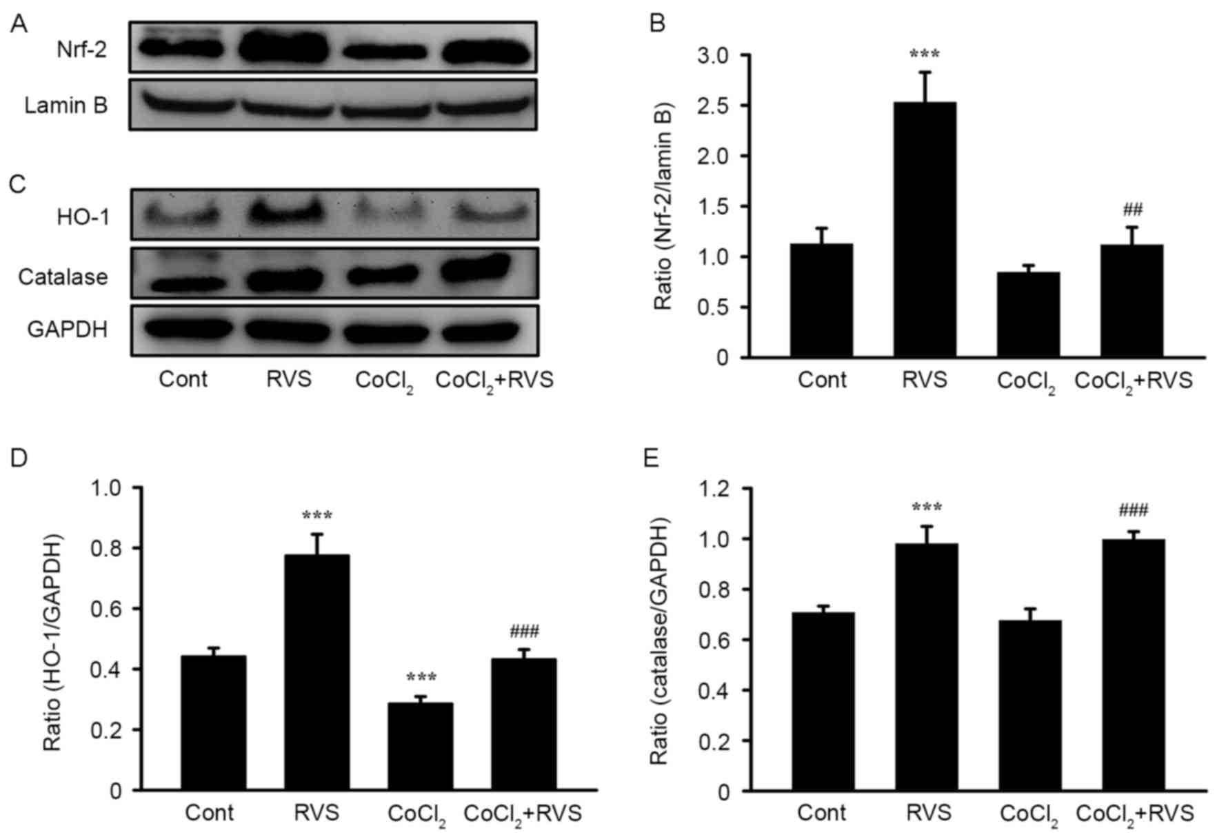 Subsequently, the expression of HO-1 and CAT in the cell homogenates from each treatment group was measured. These are major cellular antioxidant enzymes that are upregulated following Nrf2 translocation. As presented in the representative band images (Fig. 7C) and quantification graphs for HO-1 (Fig. 7D) and CAT (Fig. 7E), levels of HO-1 and CAT were significantly increased in cell homogenates from the RVS group compared with those of the control group (0.8±0.1 vs. 0.44±0.03 and 1.0±0.06 vs. 0.7±0.02, respectively, both P<0.001). In the CoCl2 group, levels of HO-1 were significantly decreased (P<0.001) but levels of CAT were unchanged, compared with the control group. However, levels of HO-1 and CAT were significantly increased in the CoCl2+RVS group compared with the CoCl2 group (0.43±0.03 vs. 0.28±0.02 and 1.0±0.03 vs. 0.7±0.04, respectively, both P<0.001). Collectively, these data suggest that RVS exerts antioxidant effects by increasing the nuclear translocation of Nrf2 and thereby upregulating the expression of cellular antioxidant enzymes, including HO-1 and CAT.