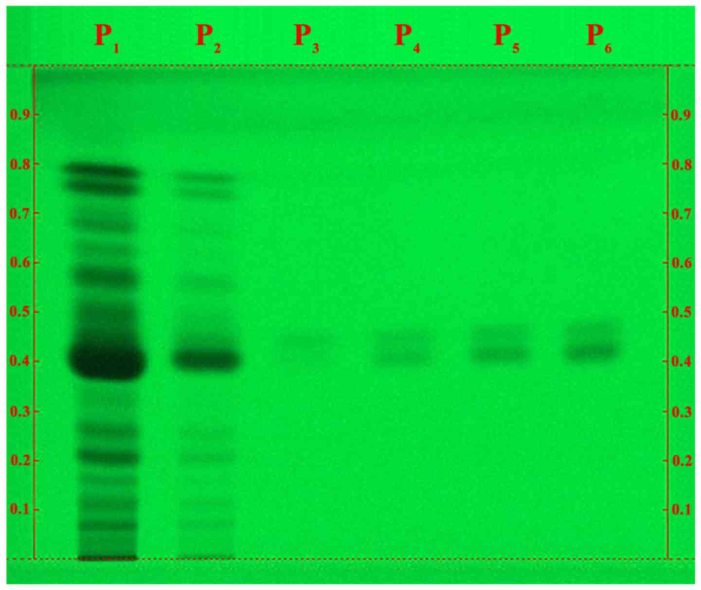 The HPTLC analysis of our extract in the optimized solvent system is a qualitative and semi-quantitative chemical testing of PN fruits for the presence of phytoconstituents. The chromatogram revealed the presence of piperine alkaloid in our PN extract, in a concentration of ~8%. A wide range of compounds other than piperine can be observed in the extract (different spots in P1 and P2 samples; Fig. 1), when compared with the P3-P6 samples, which only contain pure piperine.